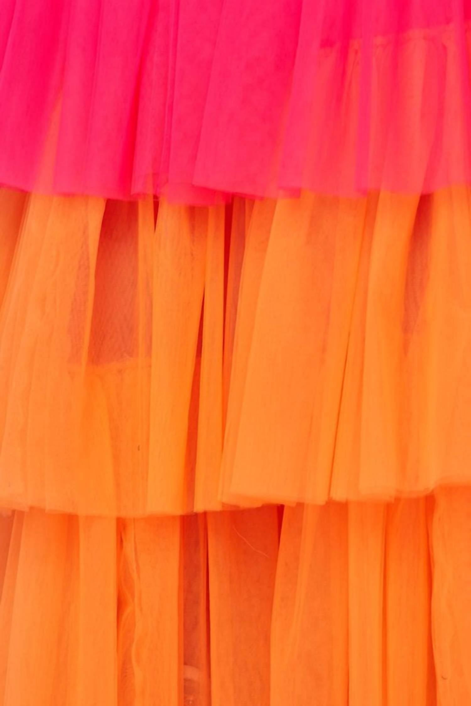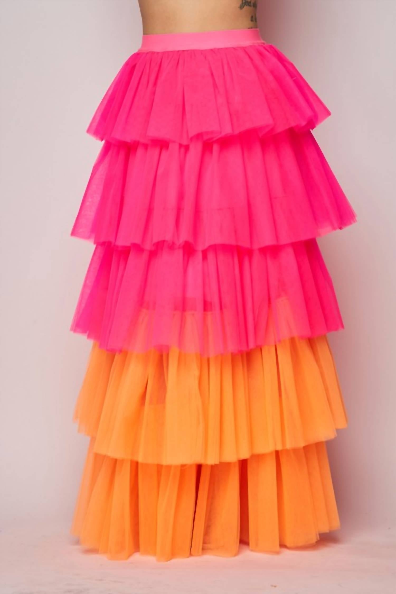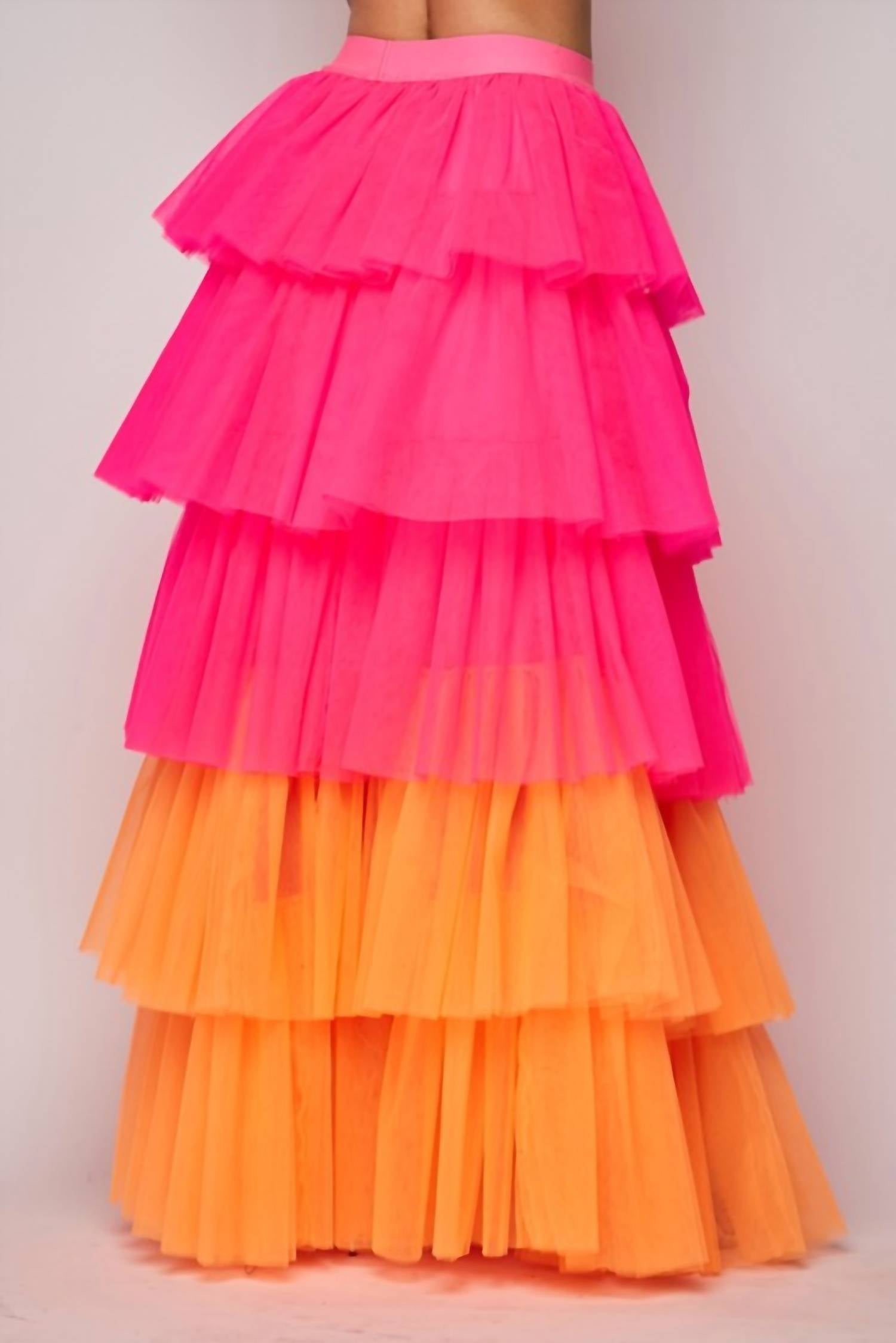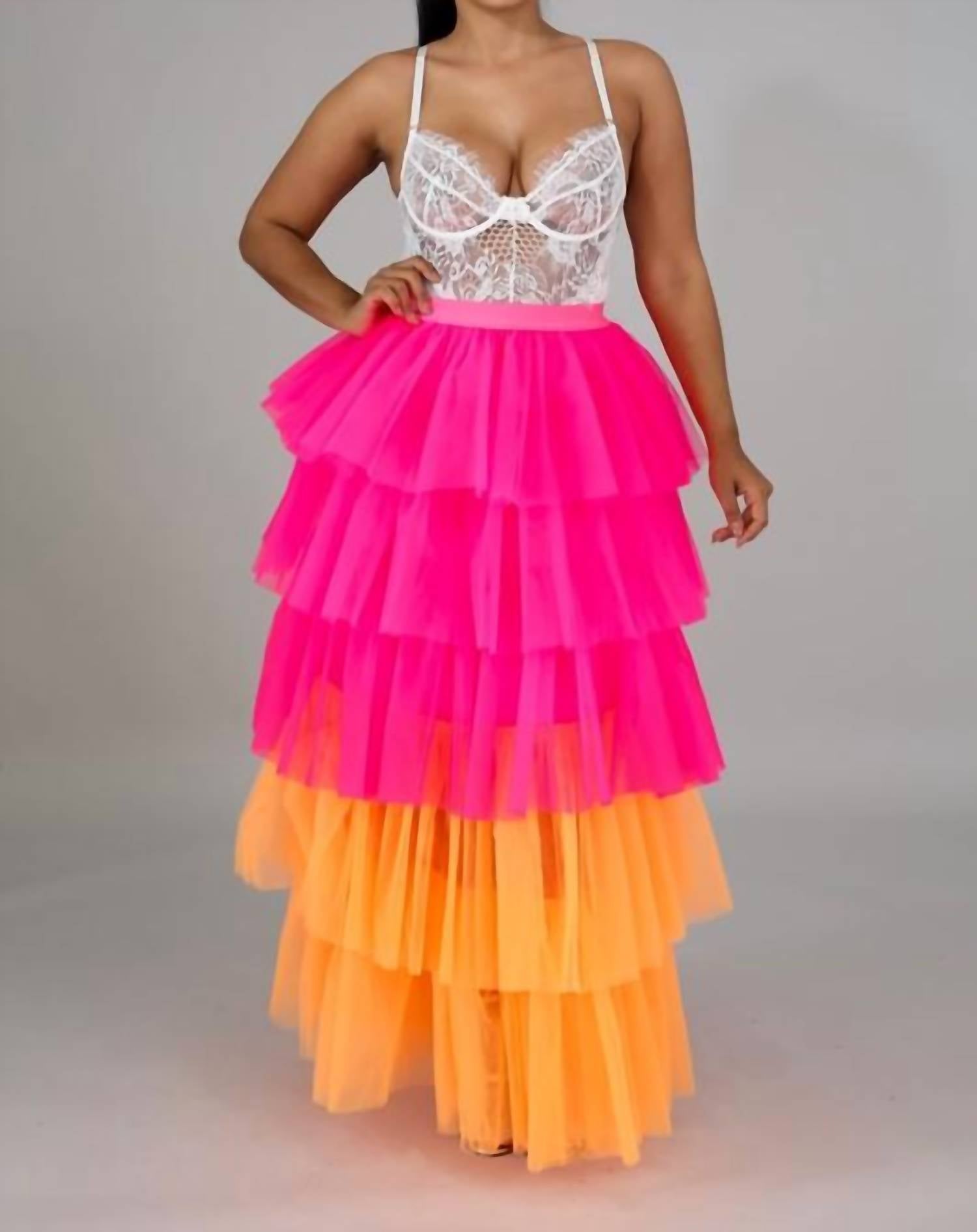 Tuck in your favorite tee for a more casual yet feminine look. Stylish maxi skirt perfect for making a statement at your next holiday party. Two-toned piece features a lovely pink and orange palette with a playful patterned tulle composition, effortlessly capturing the 90s fashion trend. Comfortable elastic waistband and a pull-on closure that makes it easy to wear. For best results, hand wash it to maintain its vibrant color and unique charm.
