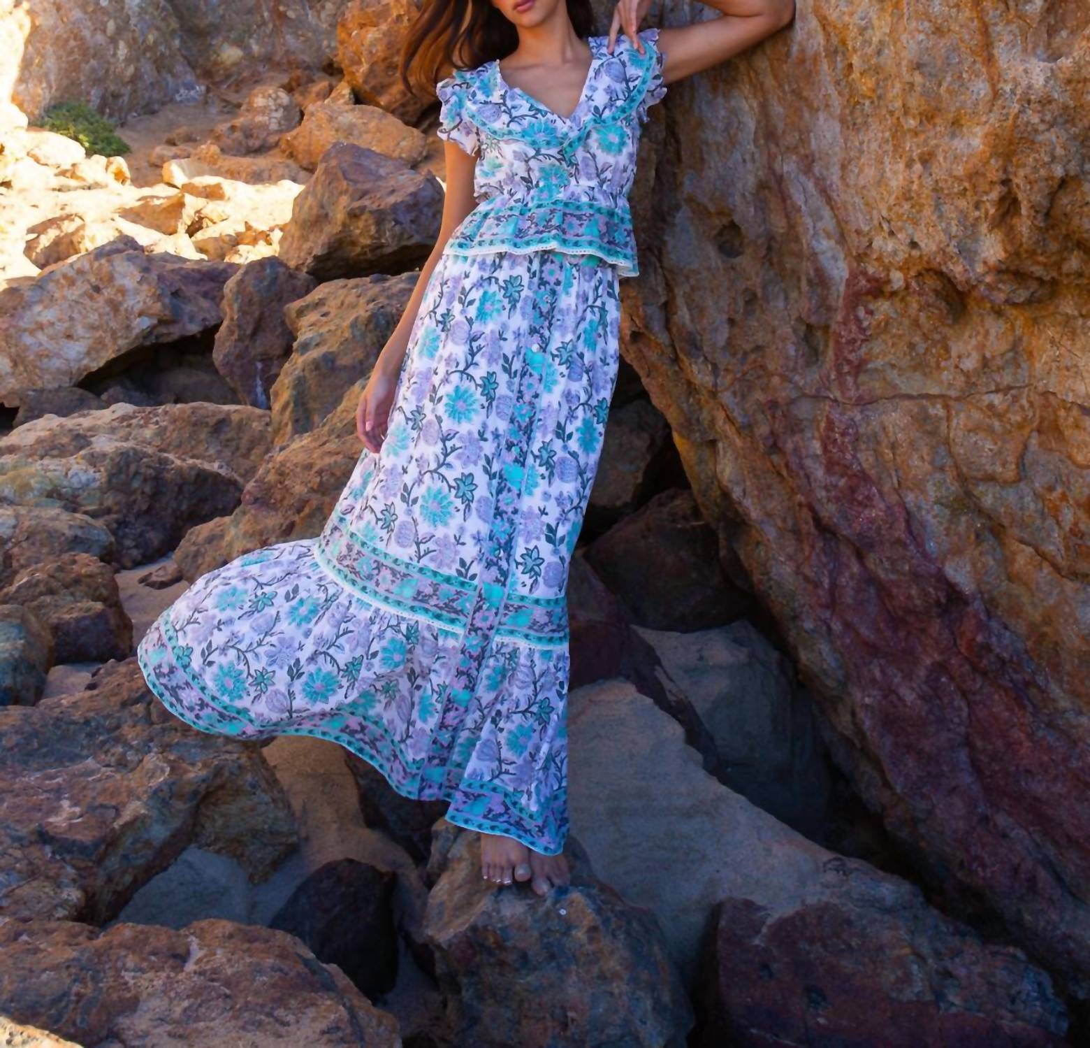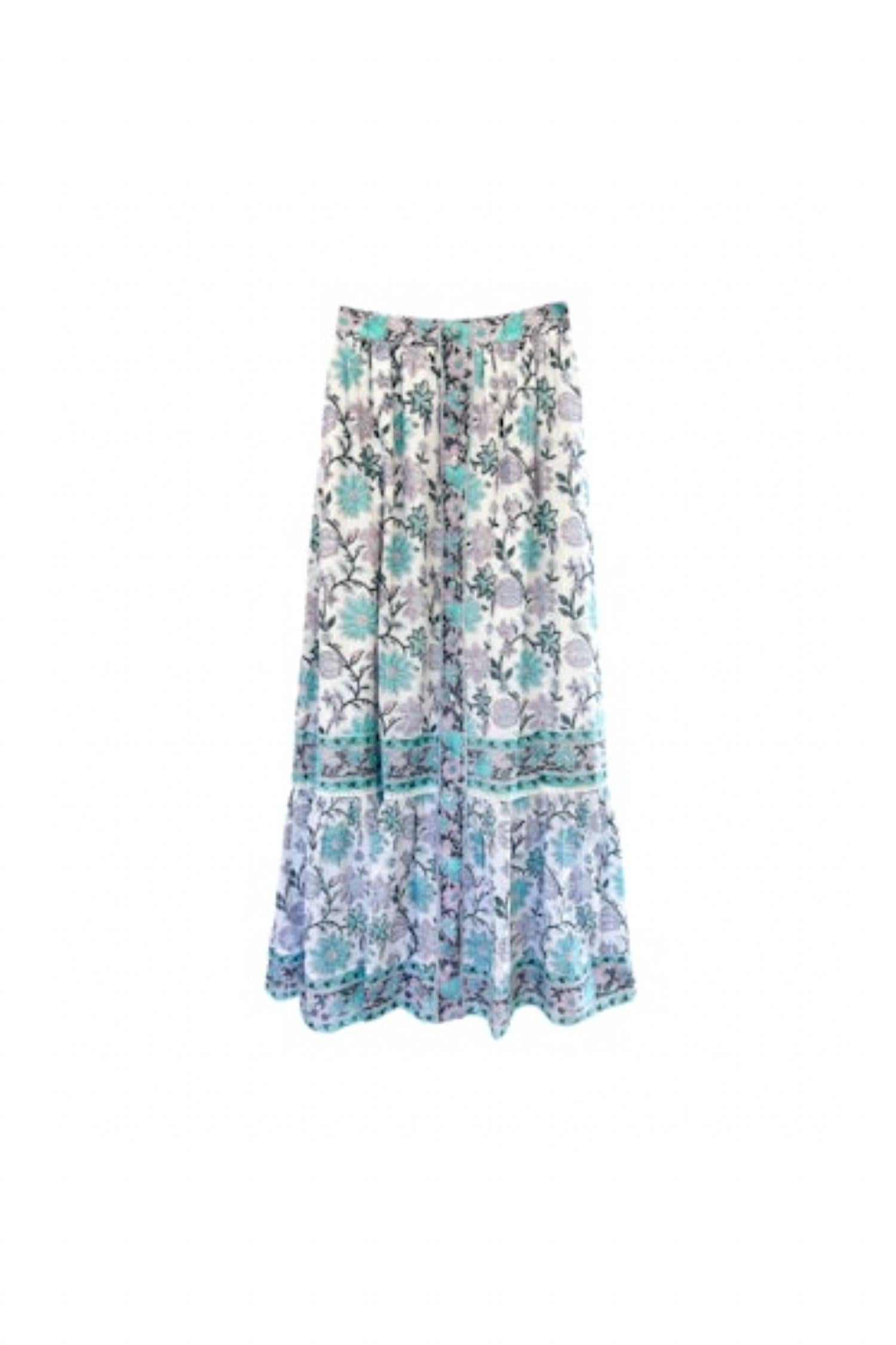Tuck in your favorite tee for a more casual yet feminine look. Embrace boho chic style with the Cece Maxi Skirt by BELL, a perfect blend of comfort and elegance. This pull-on skirt is crafted from 70% Cotton and 30% Silk, featuring a floral pattern in a delightful light turquoise and purple hue. Designed with a tiered silhouette and hand-blocked detailing, it's an ideal choice for summer vacation wear. Care is easy with machine wash instructions, making it a practical yet stylish addition to your wardrobe.