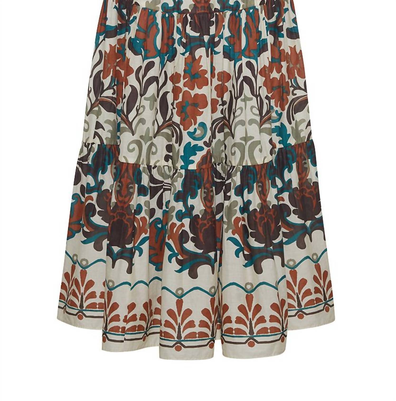 Tuck in your favorite tee for a more casual yet feminine look. Elevate your fall wardrobe with the Melanie Skirt by Cara Cara, featuring a stunning patterned design in Mira Stone. This boho chic maxi skirt is crafted from high-quality 100% Cotton Voile, offering both comfort and elegance. Made in India, the pull-on closure ensures effortless wear for any holiday party occasion. For best results, this piece should be dry cleaned or hand wash cold to maintain its vibrant look.