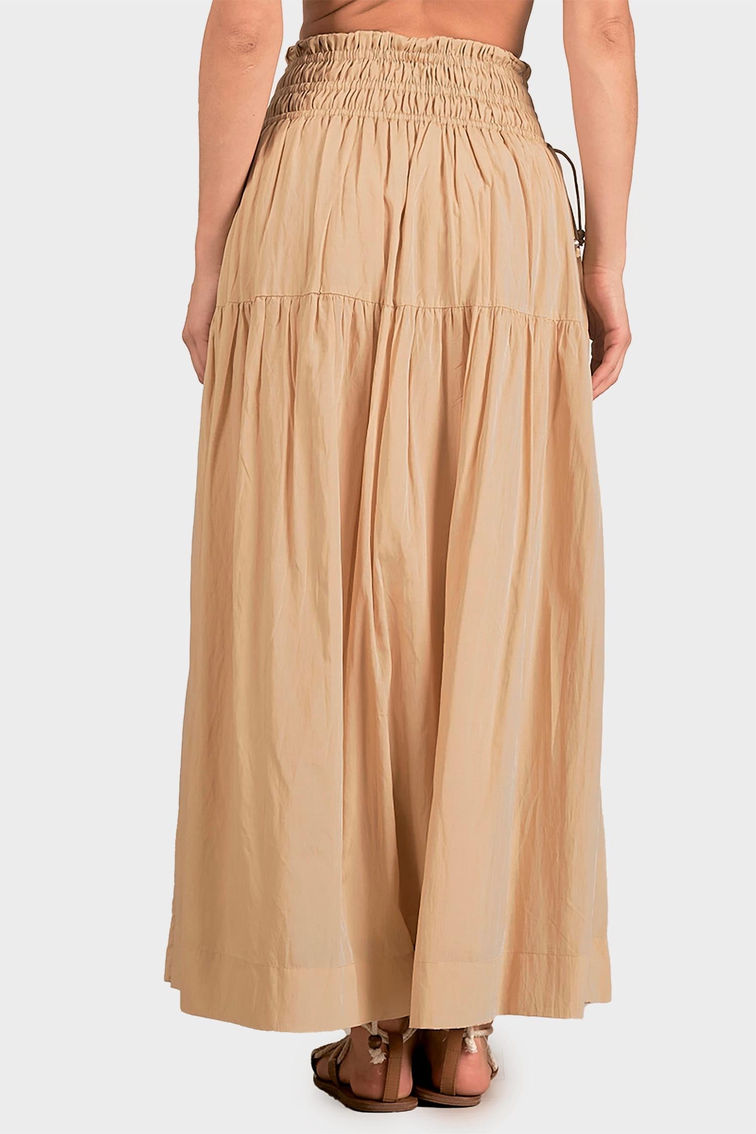Tuck in your favorite tee for a more casual yet feminine look. The ELAN Women's Tiered Maxi Skirt in taupe is a stylish choice for spring and holiday parties. It features a flattering smocked waist and an elegantly tiered design that adds volume and movement. The skirt offers a polished, solid-color look, perfect for creating versatile outfits. Note: No wash or dry care instructions were provided.