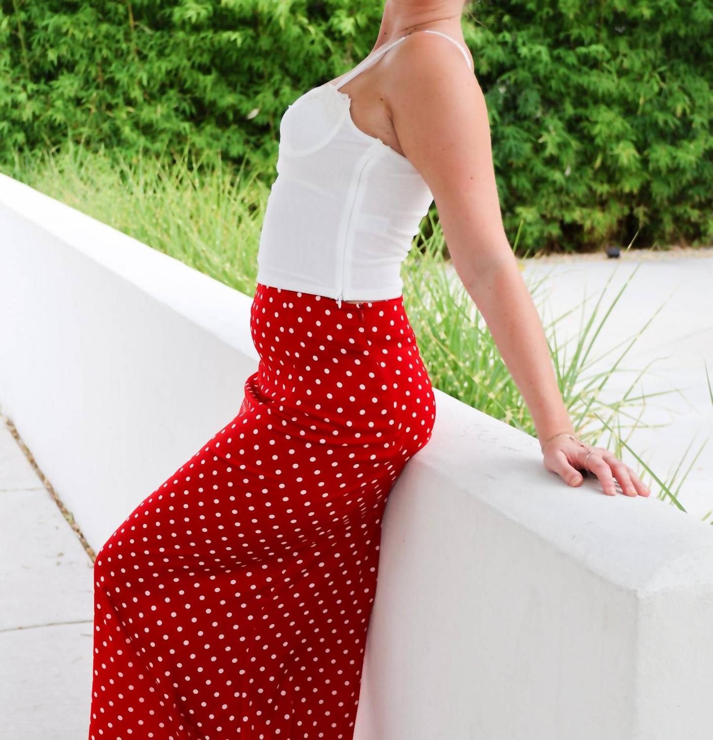 Who doesn't love a good maxi skirt? Embrace vintage glam with a modern twist in the Valero Polka Dot Maxi Skirt by Et Clet. This red satin skirt, crafted from 100% polyester, features a charming white polka dot pattern and a flattering mid-rise fit. Its flowy silhouette adds movement, while the side zipper closure ensures a sleek and easy wear. Originating from undefined, this piece should be hand washed and laid flat to dry, making it perfect for holiday parties or festive occasions this fall.