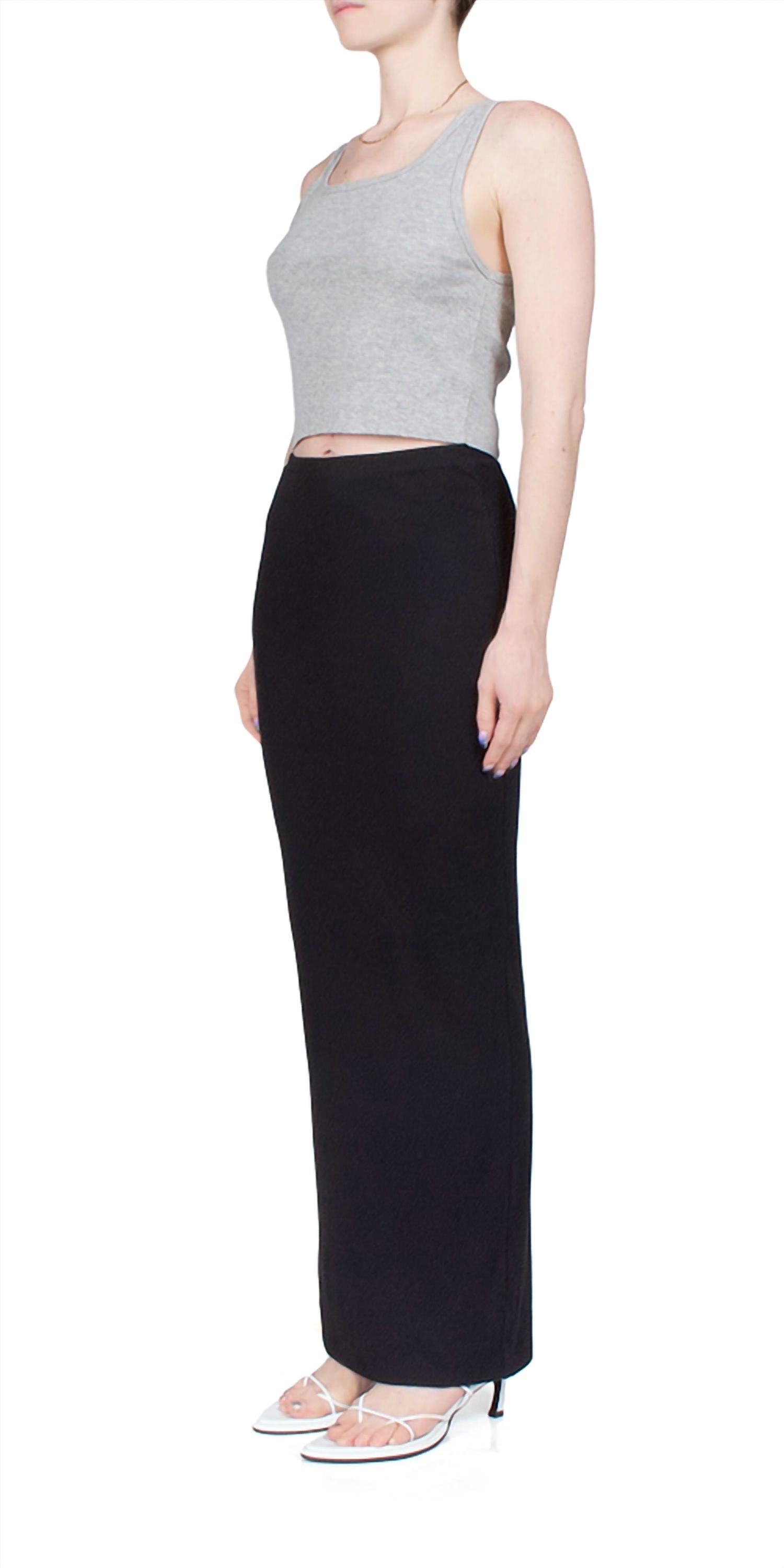 Tuck in your favorite tee for a more casual yet feminine look. Discover the Emma Butter Rib Skirt by ETERNE, a timeless addition to any wardrobe with its flattering silhouette and luxurious feel. Designed with a pull-on style, it features an elastic waistband and back hem slit for comfort and ease of movement. Crafted from a high-quality blend of 48% cotton, 48% modal, and 2% spandex, this black maxi skirt is as versatile as it is stylish. This piece, fitting true to size, brings together elegance and functionality for any occasion. Made for women and ideally suited for the fall season. Model is 5'5" and is wearing a size S.
