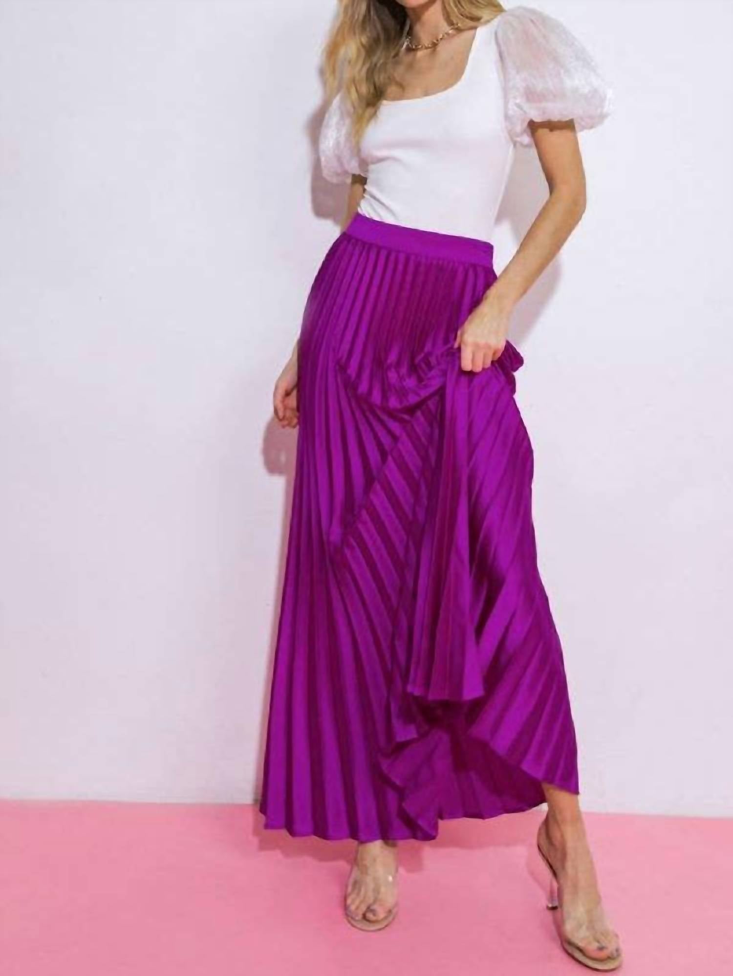 Tuck in your favorite tee for a more casual yet feminine look. Elevate your holiday party look with the Satin Fully Pleated Maxi Skirt by FLYING TOMATO in a vibrant magenta hue. This striking skirt is fully pleated and designed with a flattering 45-inch length, offering a graceful drape. It features a convenient side zipper closure for easy wear. Made from 100% polyester both self and lining, this skirt is perfect for any festive occasion. Model is 5'8" and wearing a size small.