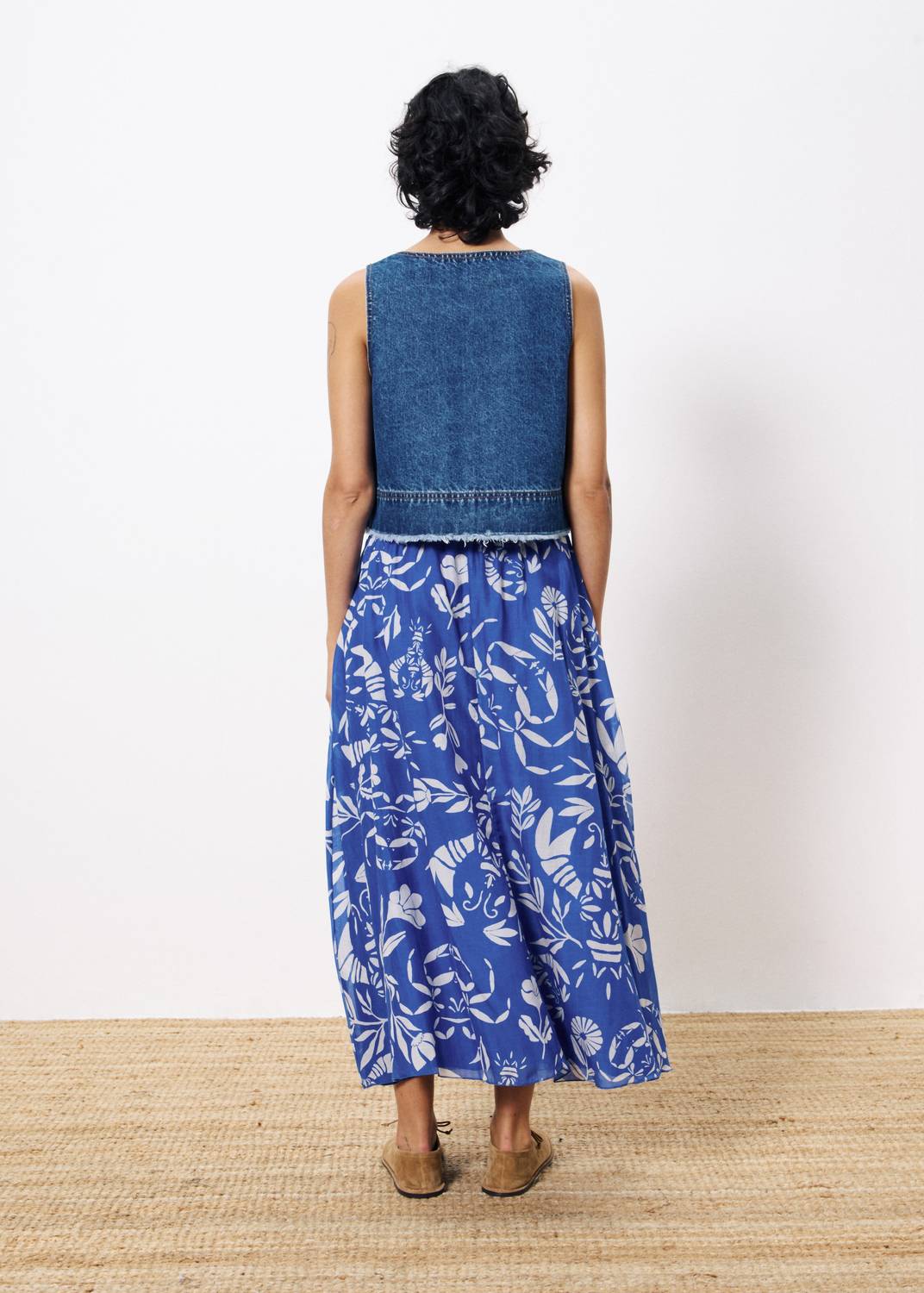 Tuck in your favorite tee for a more casual yet feminine look. Experience seaside elegance with the Coastal Maxi Skirt by FRNCH, adorned in a charming lobster and crab print. This blue skirt combines a luxe feel with a cotton and silk blend, offering a breathable and soft touch. The maxi length adds a flowing silhouette perfect for music festivals, while a tie closure ensures a custom fit. Care for it by hand washing and line drying to maintain its vibrant design. 73% Cotton, 27% Silk.