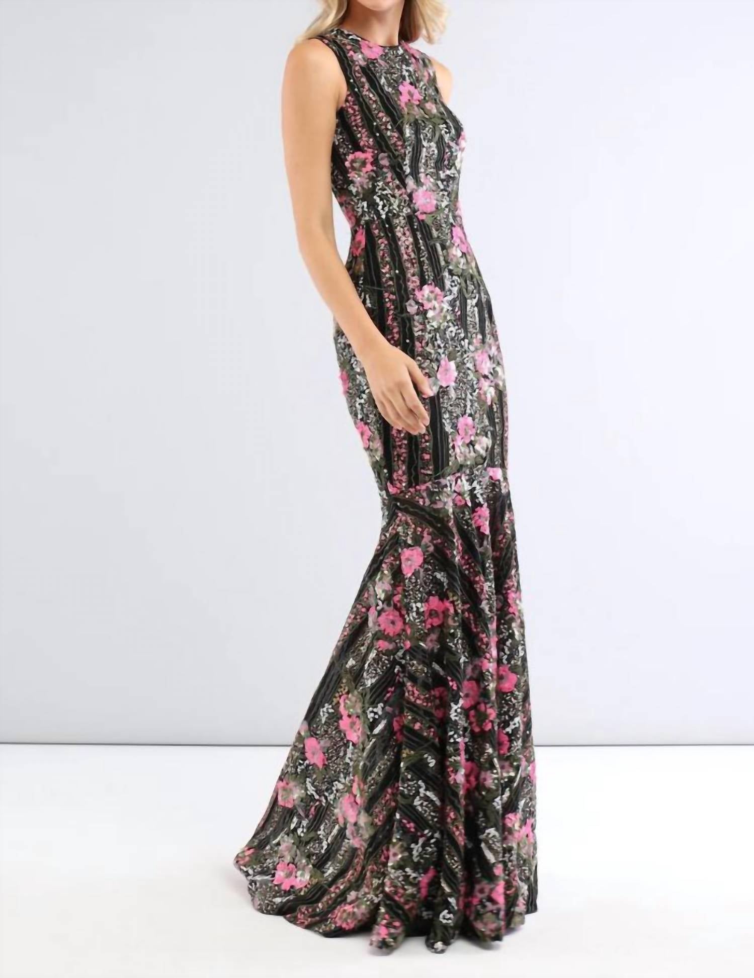 Tuck in your favorite tee for a more casual yet feminine look. Elevate your evening event look with the Louisa Trumpet Gown by Helsi, an exquisite portrayal of maximalist fashion. This sleeveless gown features a high neckline and is crafted from a luxurious sequin floral fabric in a captivating Black Fuchsia. Composition: 95% Polyester, 5% Spandex, with full lining in the same blend. Closure: Convenient center back zipper. Made in China, it promises a flawless silhouette with careful care—hand wash cold inside out, lay flat to dry, and avoid ironing or dry cleaning.