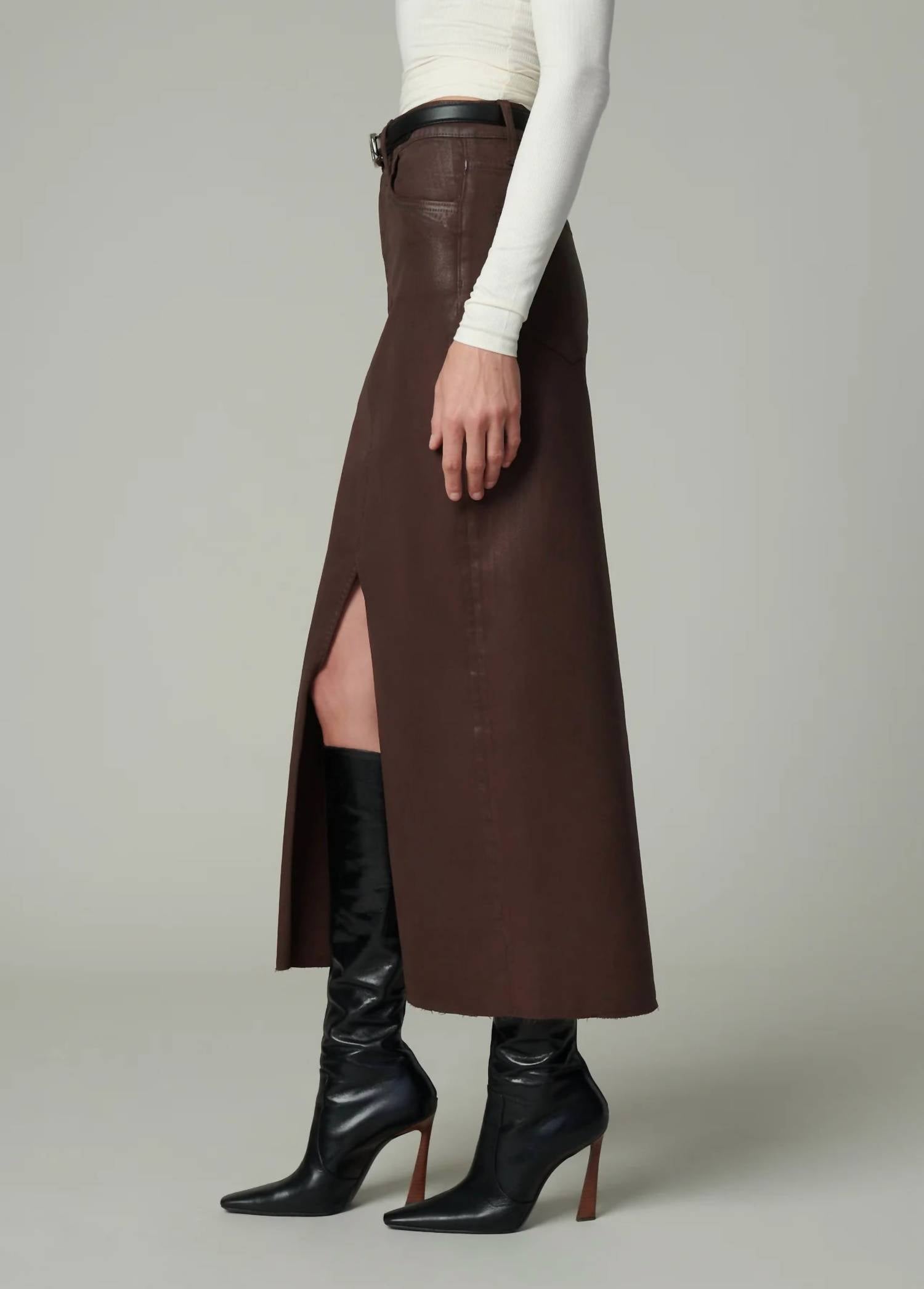 Tuck in your favorite tee for a more casual yet feminine look. Elevate your wardrobe with the Eva Coated Maxi Skirt by Joe's Jeans, an espresso-hued standout perfect for holiday parties. This maxi skirt features a high-waisted A-line silhouette with a center-front slit and a raw hem for a stylish edge, with a maxi length of 36.5" inseam. Crafted from a cotton blend (75% Cotton, 13% Lyocell, 9% Rayon, 3% Elastane), it offers a sleek, high-shine finish and a zip closure for a refined look. Ensure longevity by hand washing, turning it inside out to protect its coating, and drying it flat.