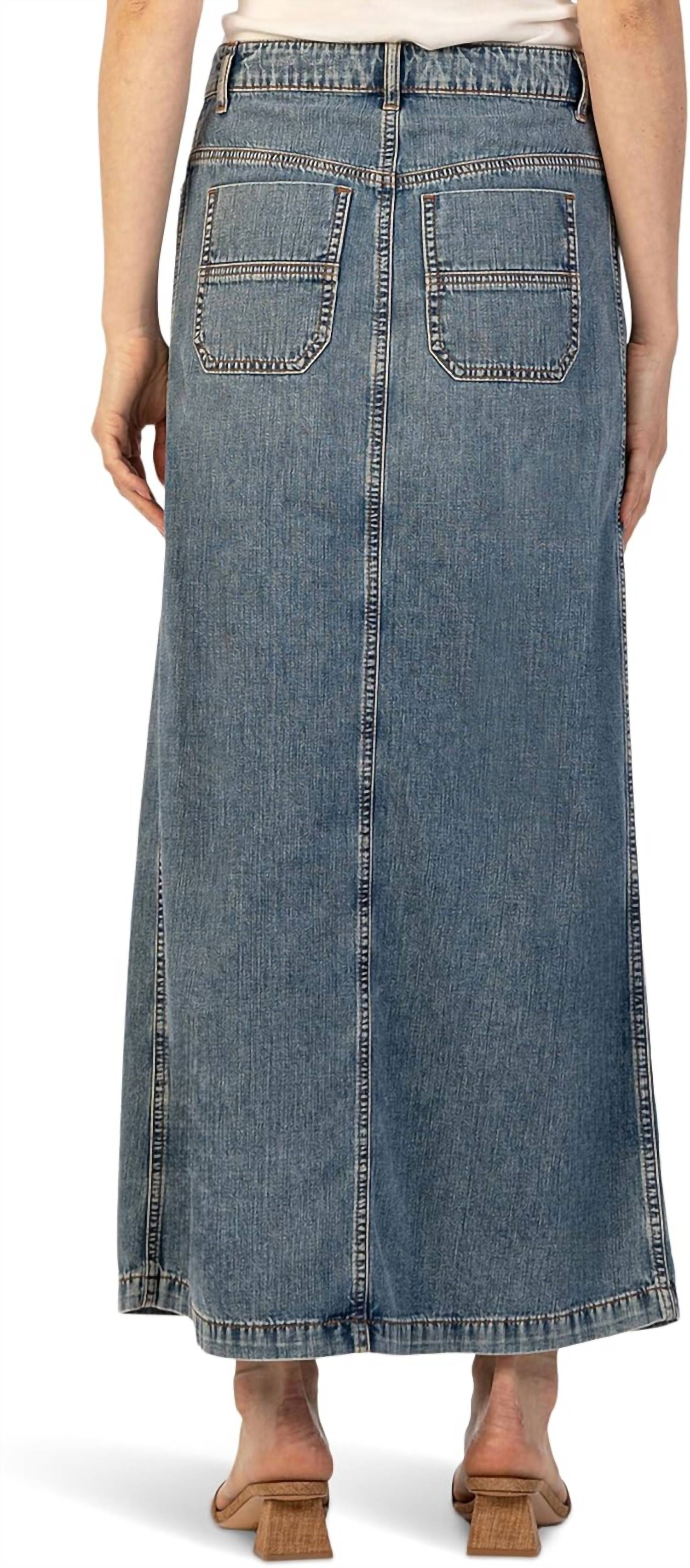 Who doesn't love a good maxi skirt? Discover the Liora Button Front Long Denim Skirt by KUT FROM THE KLOTH, an iconic addition to your spring wardrobe in a versatile med wash. Crafted from 100% cotton, this maxi-length skirt ensures all-day comfort and breathability. It features a button front closure, high-rise silhouette, and practical belt loops, complemented by two front pork chop pockets and two back pockets. Care: Machine washable. Approximate flat measurements: Waist 16”, Length 37.5”.