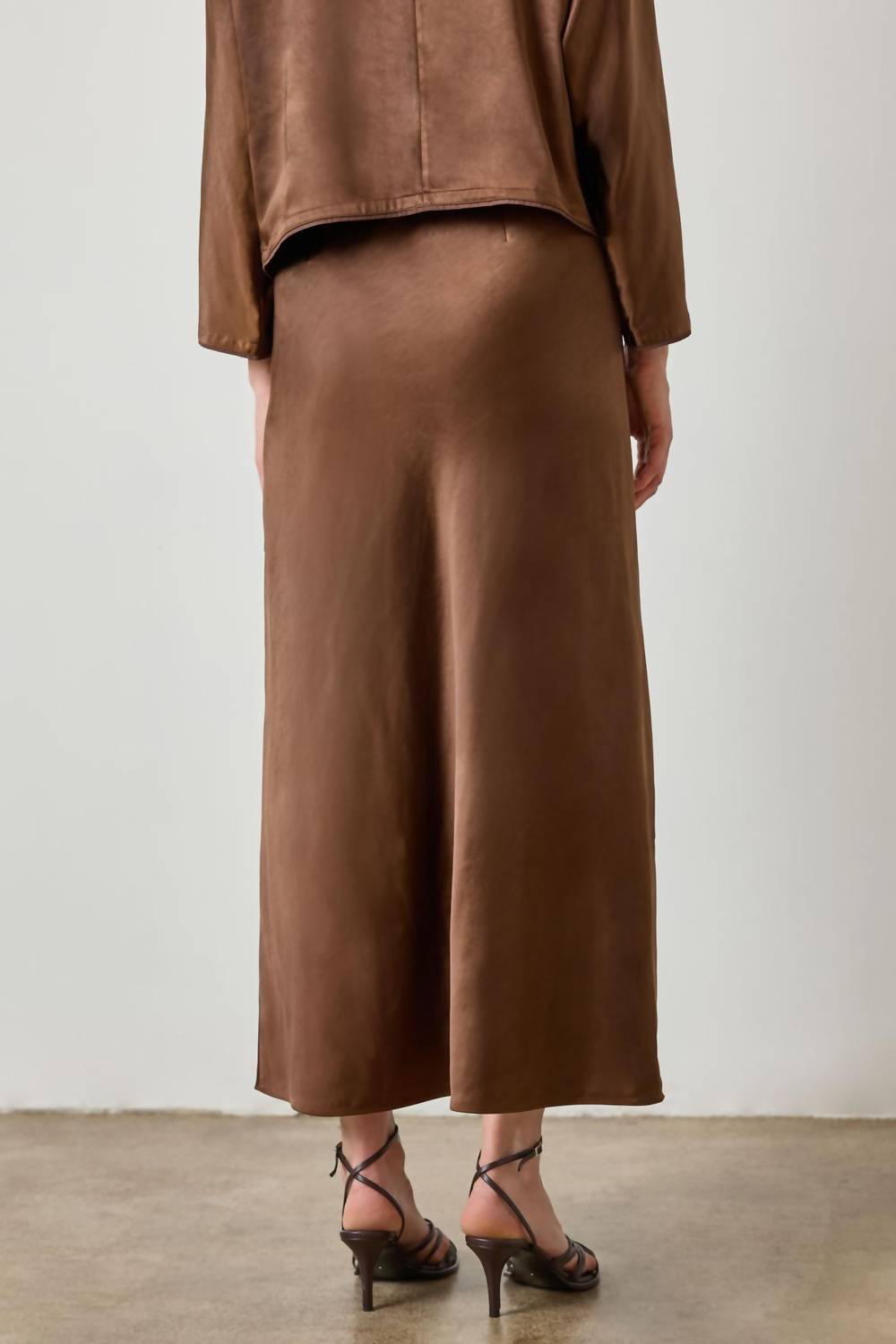 Who doesn't love a good maxi skirt? Indulge in effortless elegance with the Satin Slit Front Skirt by Lilla P, a staple for your fall wardrobe in rich chocolate. Crafted from 100% polyester satin twill, this bias-cut maxi design features a flattering fit that elegantly skims the body. Its hidden elastic waistband ensures a comfortable wear, while an asymmetrical seam and off-center slit provide a chic, modern twist. Care for this timeless piece with dry cleaning to maintain its soft matte sheen.