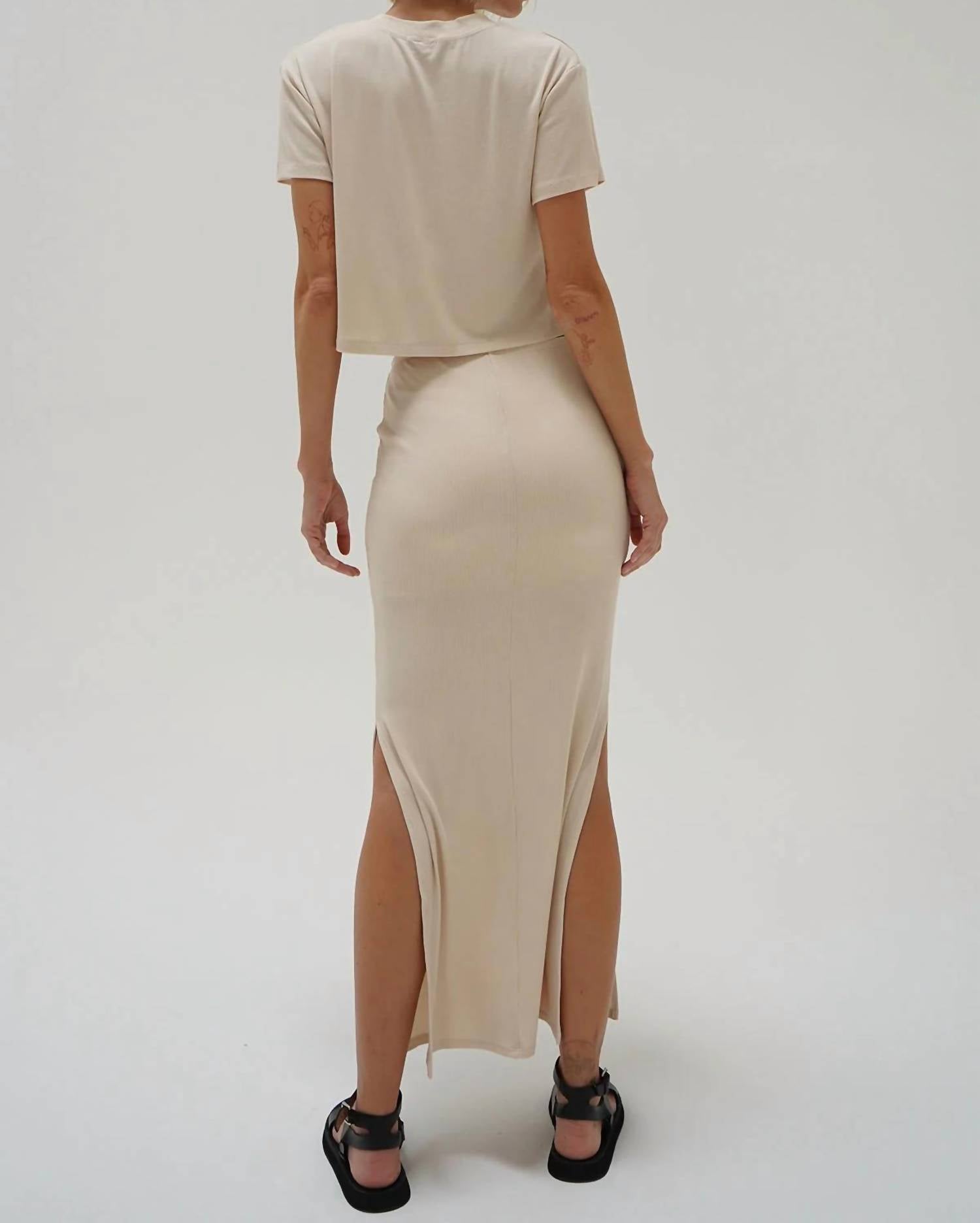 Flowy, comortable and stylish. This maxi skirt is a fan favorite. Step out in effortless elegance with the LNA Steph Ribbed Skirt in bone, ideal for a chic beach day. This maxi skirt is composed of 95% Rayon and 5% Spandex, ensuring comfort and a flattering fit. Designed with a versatile length of 37.75 inches and side slits, this piece offers a customizable wear with its pull-on closure. Made in the USA, it's easy to care for with machine wash cold and a low tumble dry.