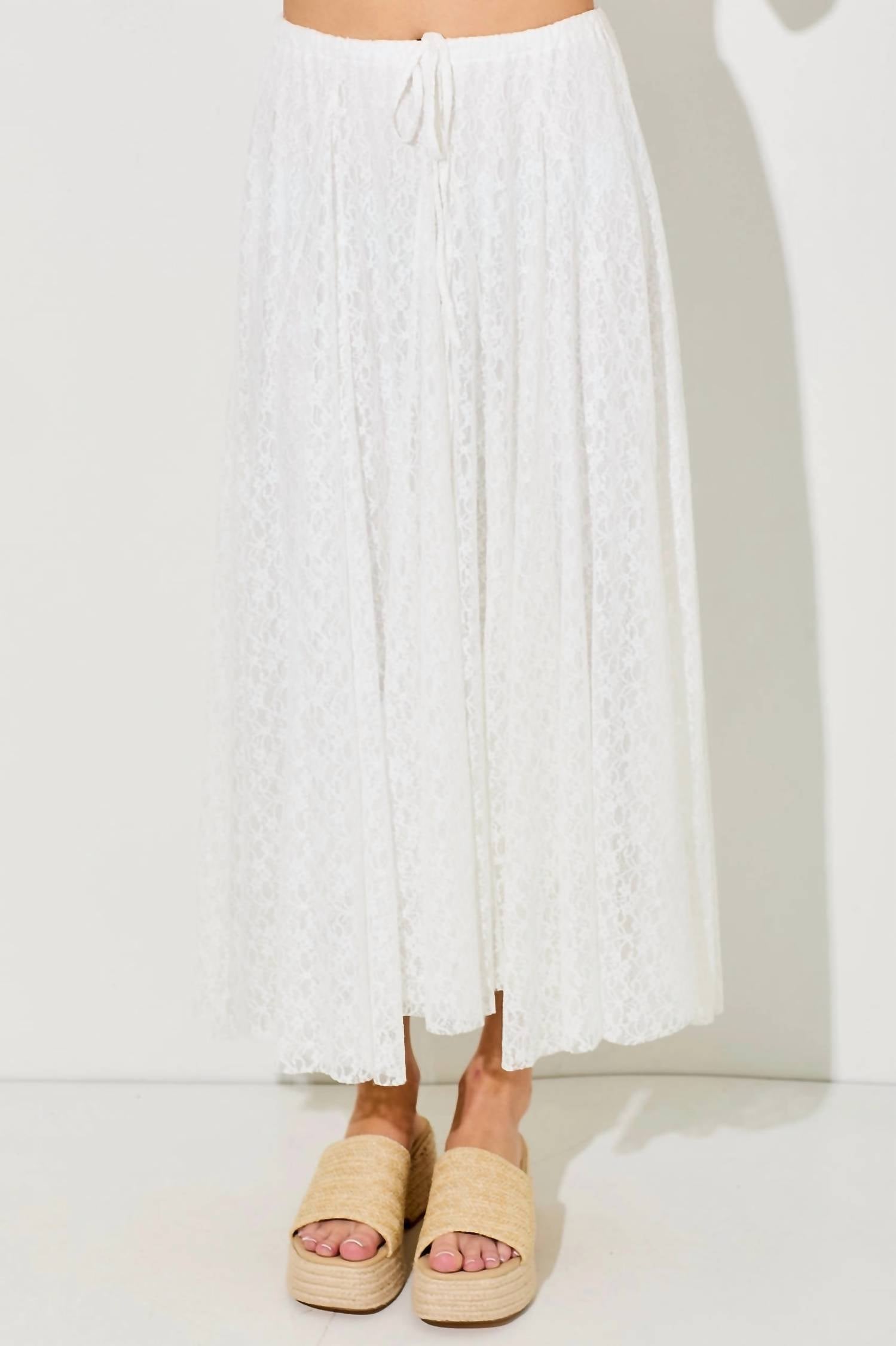 Tuck in your favorite tee for a more casual yet feminine look. Add a touch of boho chic to your wardrobe with the Women's Lira Skirt by Polagram in a solid white hue. This beautifully flowing maxi-length skirt features a lace-paneled design with an adjustable drawstring waist for a perfect fit. It is composed of 95% Nylon and 5% Spandex with a lining of 100% Polyester, offering both comfort and style, and is made in China. The skirt is a pull-on style, making it easy to wear, and requires hand wash care to maintain its delicate details.