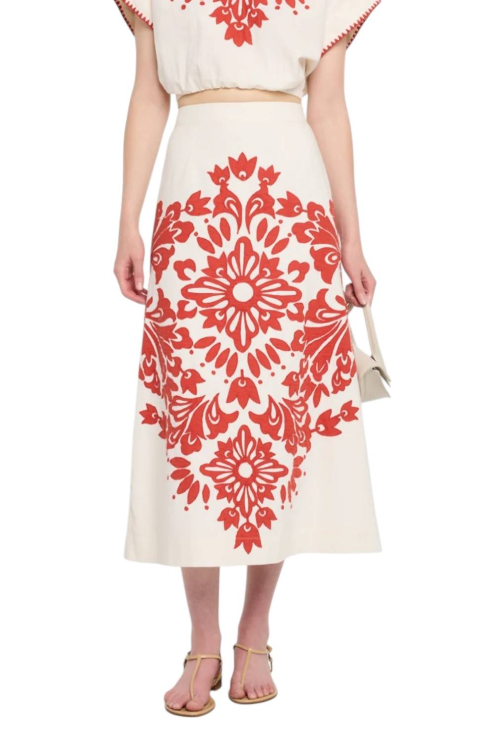 Tuck in your favorite tee for a more casual yet feminine look. Elevate your evening attire with the Liliana Applique Skirt by SEA, a chic maxi piece perfect for minimalist and spring trends. This skirt showcases intricate appliqué detailing on a classic red midi silhouette, offering a rich textural depth. Crafted from 88% cotton, 12% linen, with 100% cotton appliqué, it ensures a comfortable fit with a zip closure. Imported and designed for easy maintenance with dry cleaning. Ideal for Thanksgiving celebrations or any sophisticated evening event.