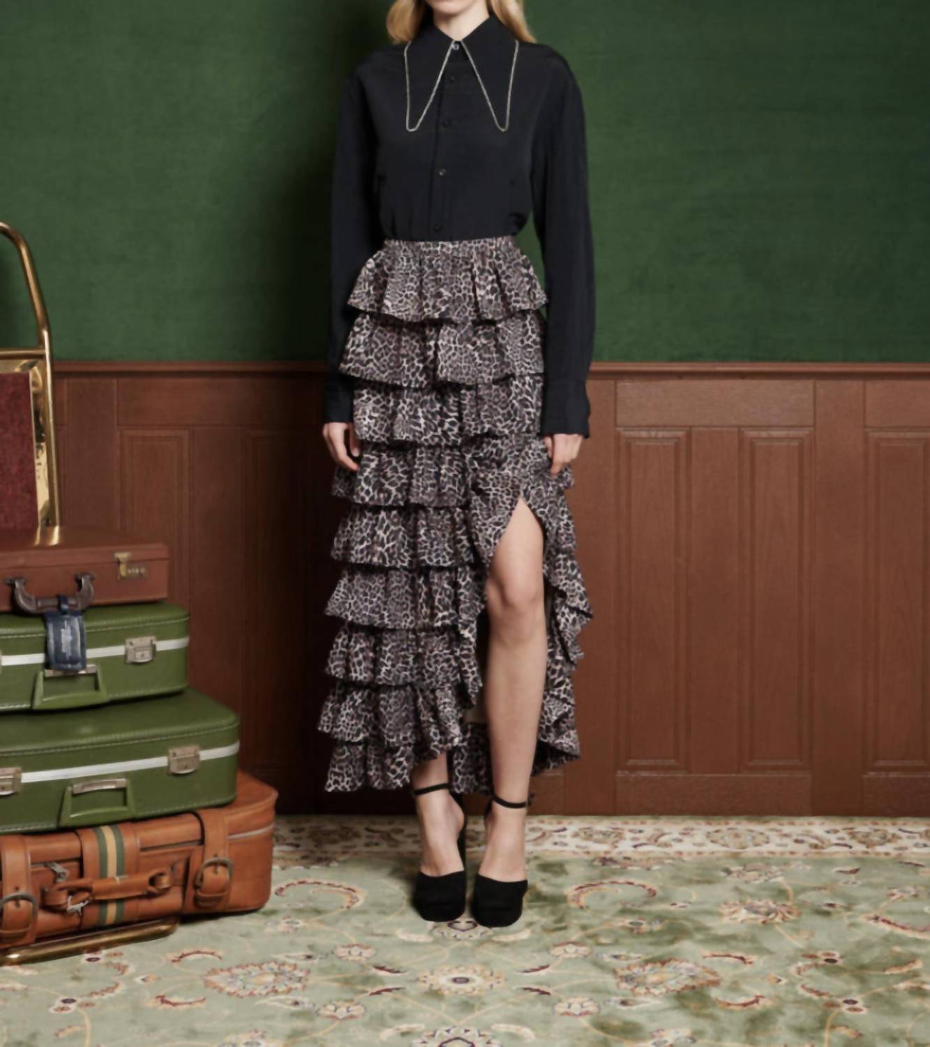 Flowy, comortable and stylish. This maxi skirt is a fan favorite. Elevate your wardrobe with the Lennox Ruffle Skirt by Sister Jane, crafted in a striking leopard brown print for boho chic vibes. This long, high-waisted skirt is made from a sustainable fabric blend, featuring 100% recycled polyester for the main fabric and a lined interior for added comfort. Its tiered A-line design includes gathered tiers and a stylish front split, with a zip closure ensuring a sleek fit. Expertly made in China, this skirt requires hand washing and ironing inside out, while avoiding tumble drying.