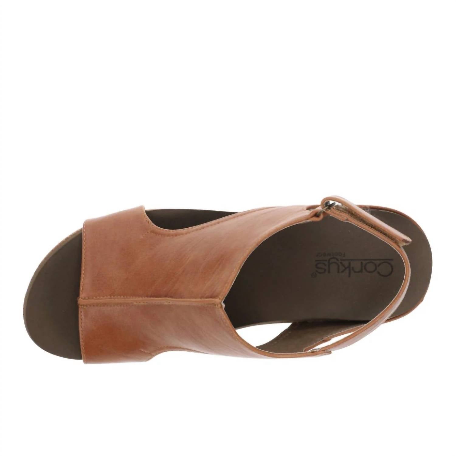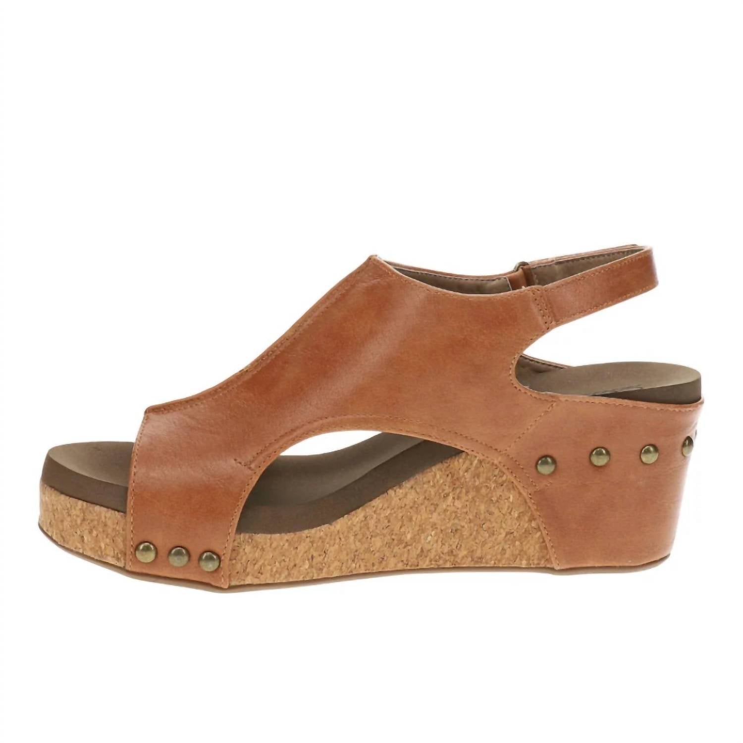 Classicly cute and all-day-wearable. We love this sandal. Step into effortless style with the Women's For Keeps Wedge Sandals by Corkys Footwear, crafted in a rich rust faux leather. These sandals feature a high wedge heel, providing a stylish lift while ensuring comfort with the signature Corkys cushioned footbed. Designed with a convenient hook-and-loop closure, they offer a secure and adjustable fit. Perfect for spring travel, the lightweight cork wedge and studded trim add a touch of personality to any minimalist ensemble.