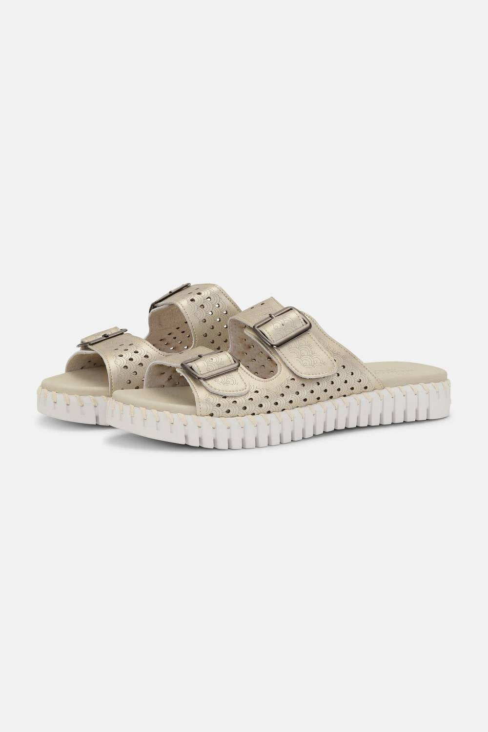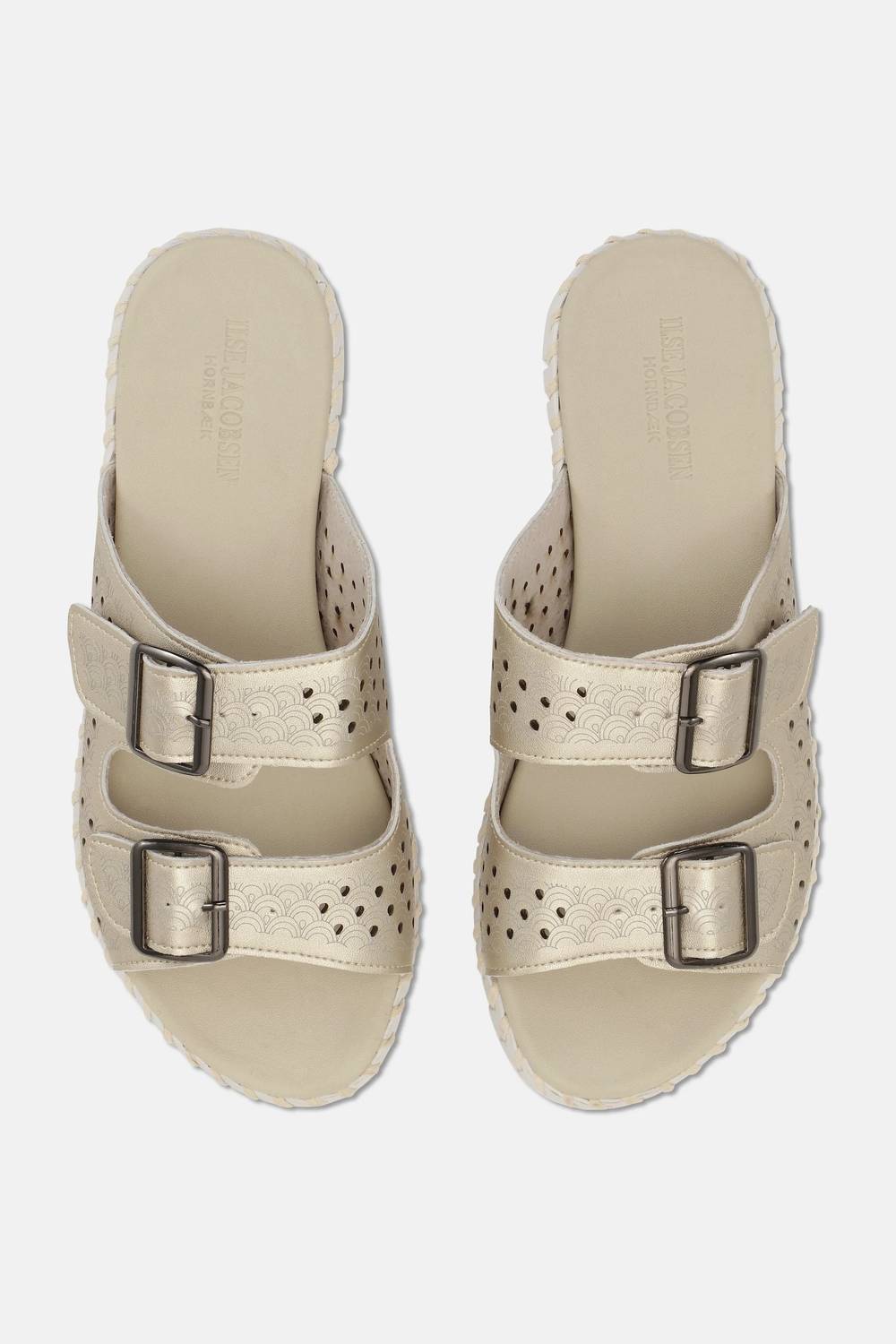 Flowy dresses, cropped pants, and even jumpsuits... this sandal works with them all! Step into summer travel with the Women's Tulip Sandals by Ilse Jacobsen, featuring a chic open toe design. The light weight upper is crafted from metallic microfiber adorned with a decorative laser cut pattern. This sandal boasts a flat heel with an outsole made of 75% natural rubber and 25% recycled rubber, perfect for boho chic style. Ideal for both comfortable wear and eco-conscious fashion.