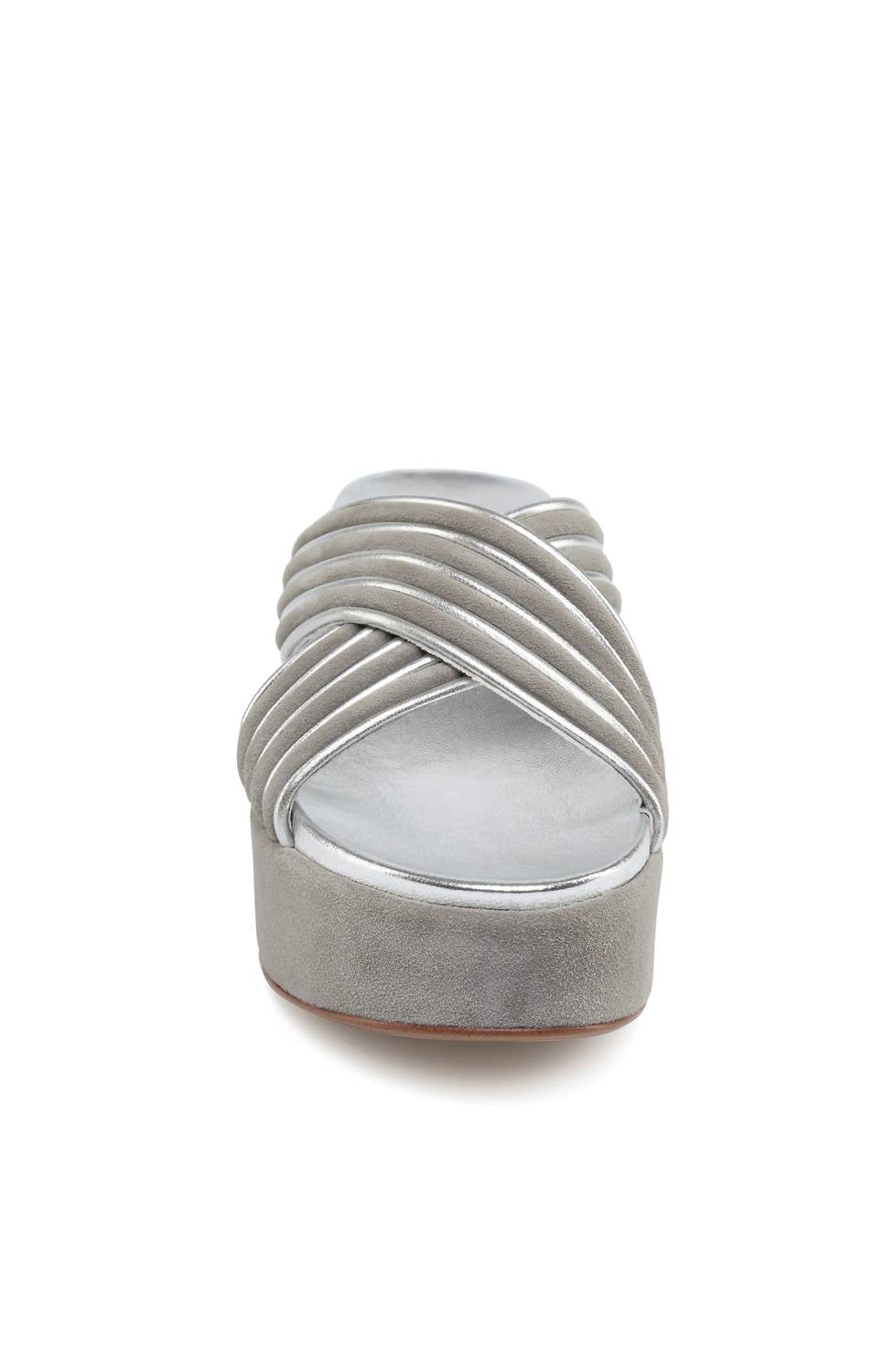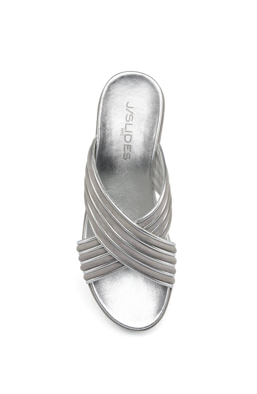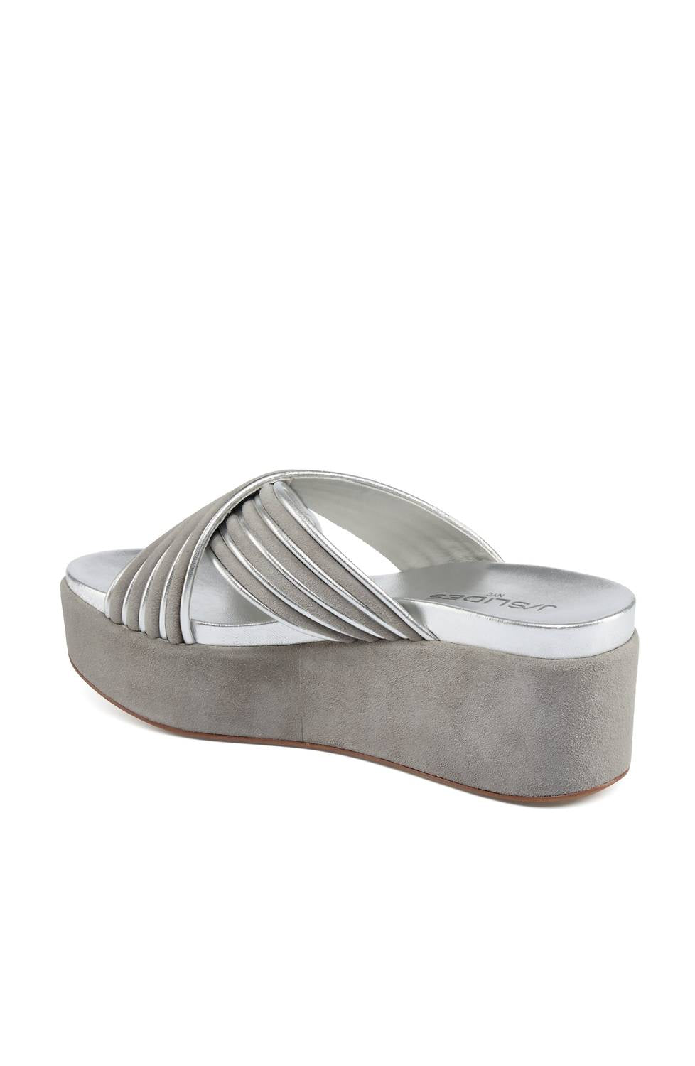 This sandal will take you from brunch to dinner and everything in between. Discover the J/SLIDES Women's Quiana Platform Sandals, crafted with refined elegance and versatility in mind. These sandals feature a mixed leather and suede upper with intricately woven criss-cross straps, complemented by a leather lining for an elevated look. The platform wedge provides a mid-heel height of 2.5 inches, offering excellent arch support and stability. Ideal for any summer occasion, these grey/silver sandals boast an open toe design and dual-layer memory foam insole for unparalleled comfort.