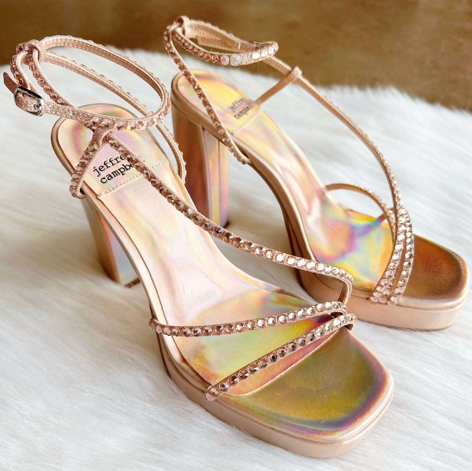 Classicly cute and all-day-wearable. We love this sandal. Elevate your evening look with the Women's Aperitivo Metallic Platform Heeled Sandal by Jeffrey Campbell, crafted in a striking rose gold metallic. These eye-catching sandals feature jeweled straps and a chic open toe, perfect for maximalist trends and spring occasions like New Year's Eve. Designed for women, they provide a bold statement for any evening event with their platform heel style. Whether you're stepping out for a special occasion or embracing the latest trends, these sandals add a glamorous touch to your ensemble.