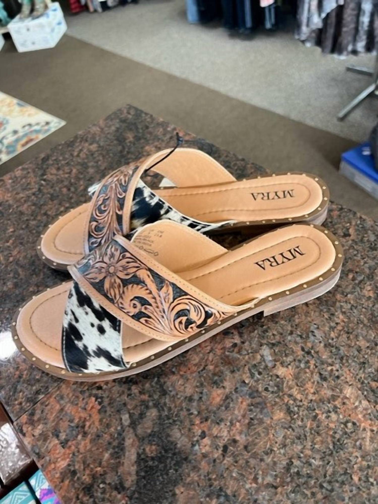 Flowy dresses, cropped pants, and even jumpsuits... this sandal works with them all! Introducing the Women's Hand Tooled Leather Sandals by Myra, blending boho chic style with all-day comfort. Crafted with exquisite leather and cowhide accents, these sandals feature an open toe design and flat heel for ease of wear. Perfect for a summer holiday party or casual Thanksgiving gathering, these sandals are a versatile addition to any wardrobe. Enjoy both comfort and style on any occasion.