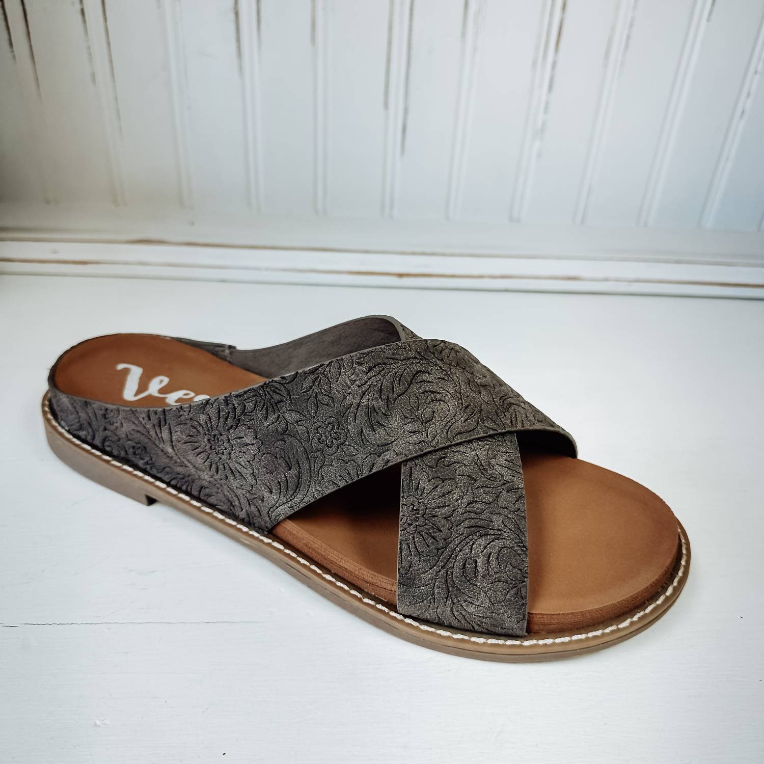 This sandal will take you from brunch to dinner and everything in between. Step out in style with the Women's Tawney Tooled Sandal by Very G, a chic addition to any summer wardrobe. Featuring a criss-cross strap and tooled faux leather upper, this sandal offers a comfortable and stylish flat heel design. With a cushioned footbed, the slip-on style ensures easy wear while the 1" platform adds subtle elevation. Perfect for vacation or everyday wear, this sandal embraces boho chic flair.