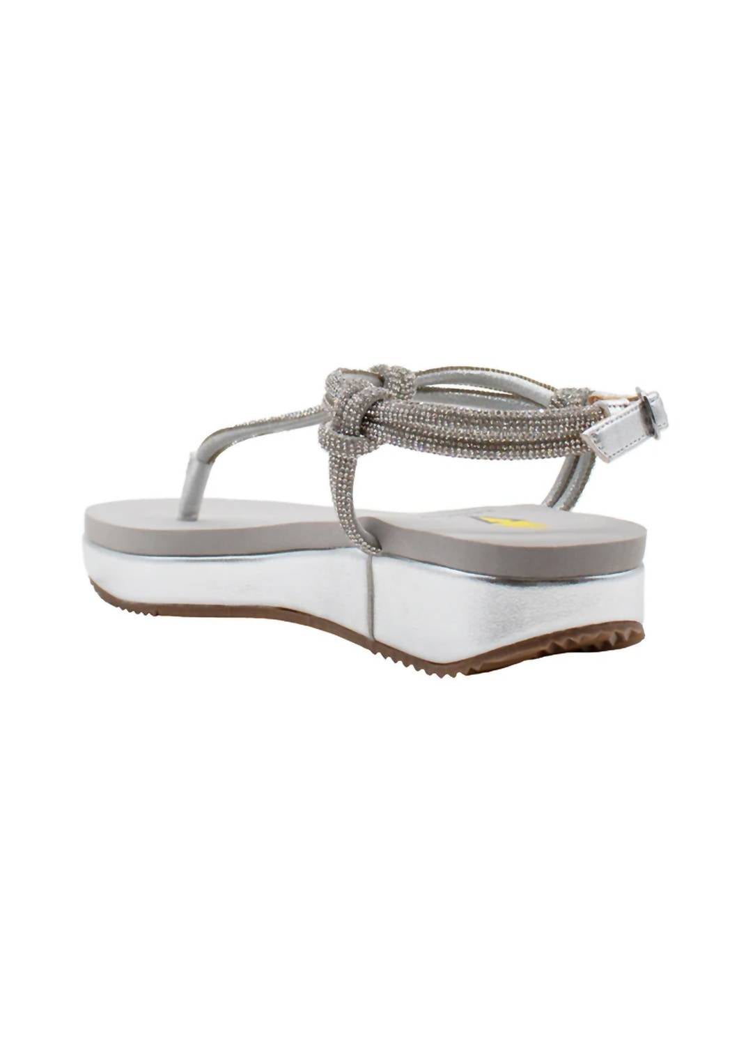 Elevate your summer wardrobe with the Women's Calypso Rhinestone Thong Sandal by VOLATILE, a captivating blend of glamour and comfort. Featuring a rhinestone and textile upper and a sleek metal buckle closure, this sandal offers a secure and adjustable fit. With a tonal metallic faux leather wedge, these sandals provide a 1.25" heel for just the right lift, complemented by a signature EVA insole and rubber outsole for all-day support. Perfect for summer occasions, from travel to streetwear celebrations, in a dazzling Silver Sparkle.