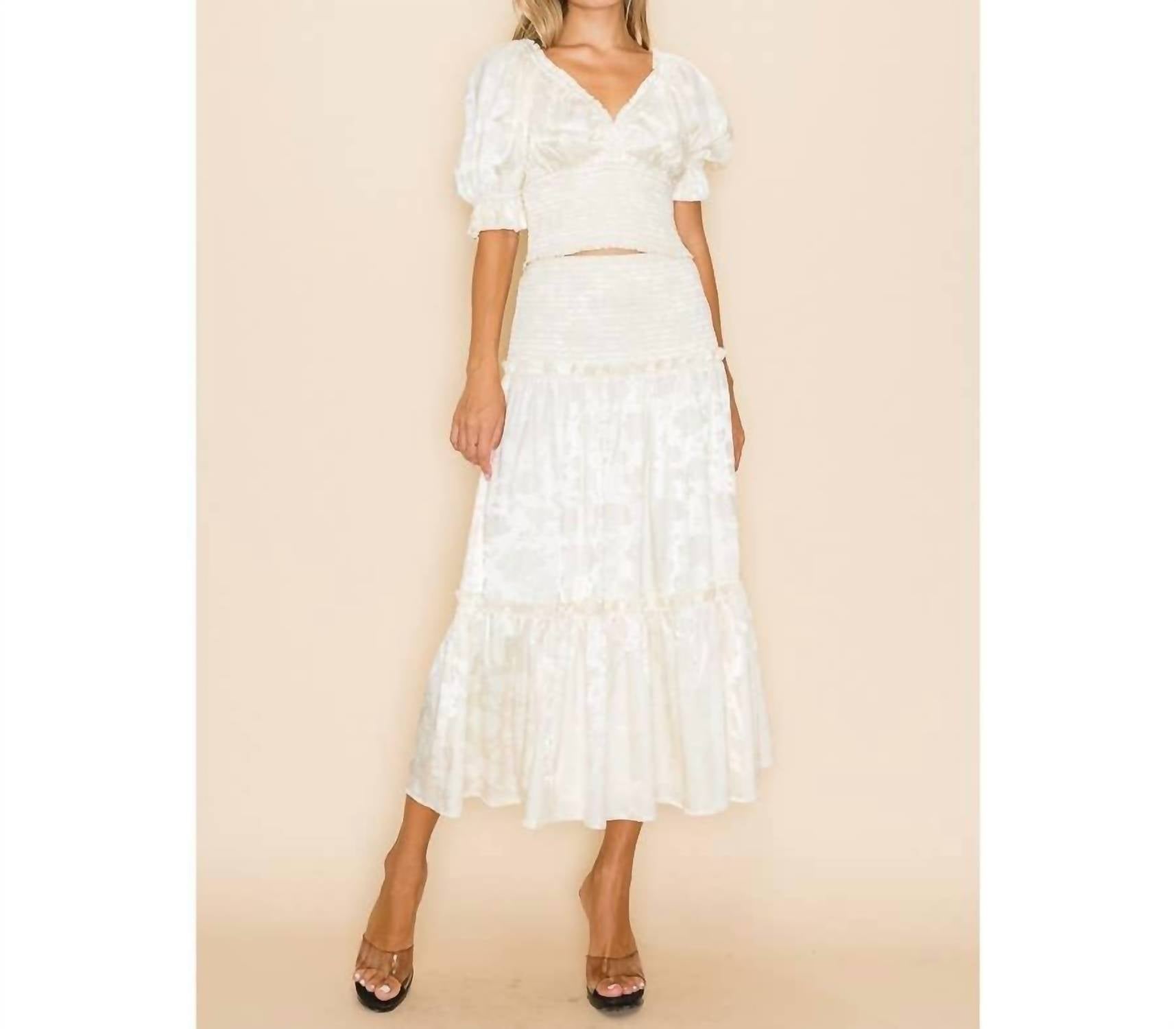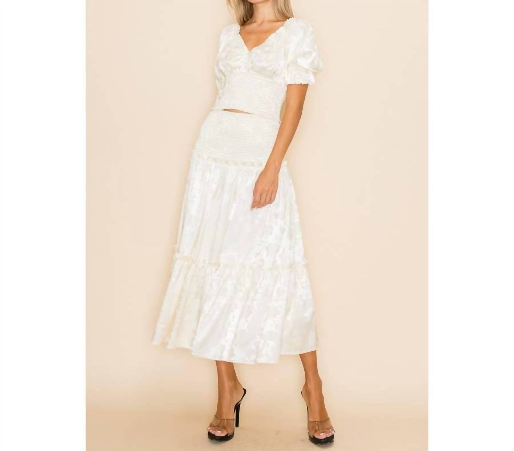 Tuck your favorite tee into this midi length skirt for an effortlessly cool look. Elevate your wedding wardrobe with the Tiered Satin Jacquard Midi Skirt by INA Fashion, crafted in a luxurious satin material. This women's skirt features a high waist and textured pattern, adding a touch of elegance to its tiered design in a chic ivory hue. It is a pull-on style for ease and comfort, ideal for summer occasions. Care instructions are not provided.
