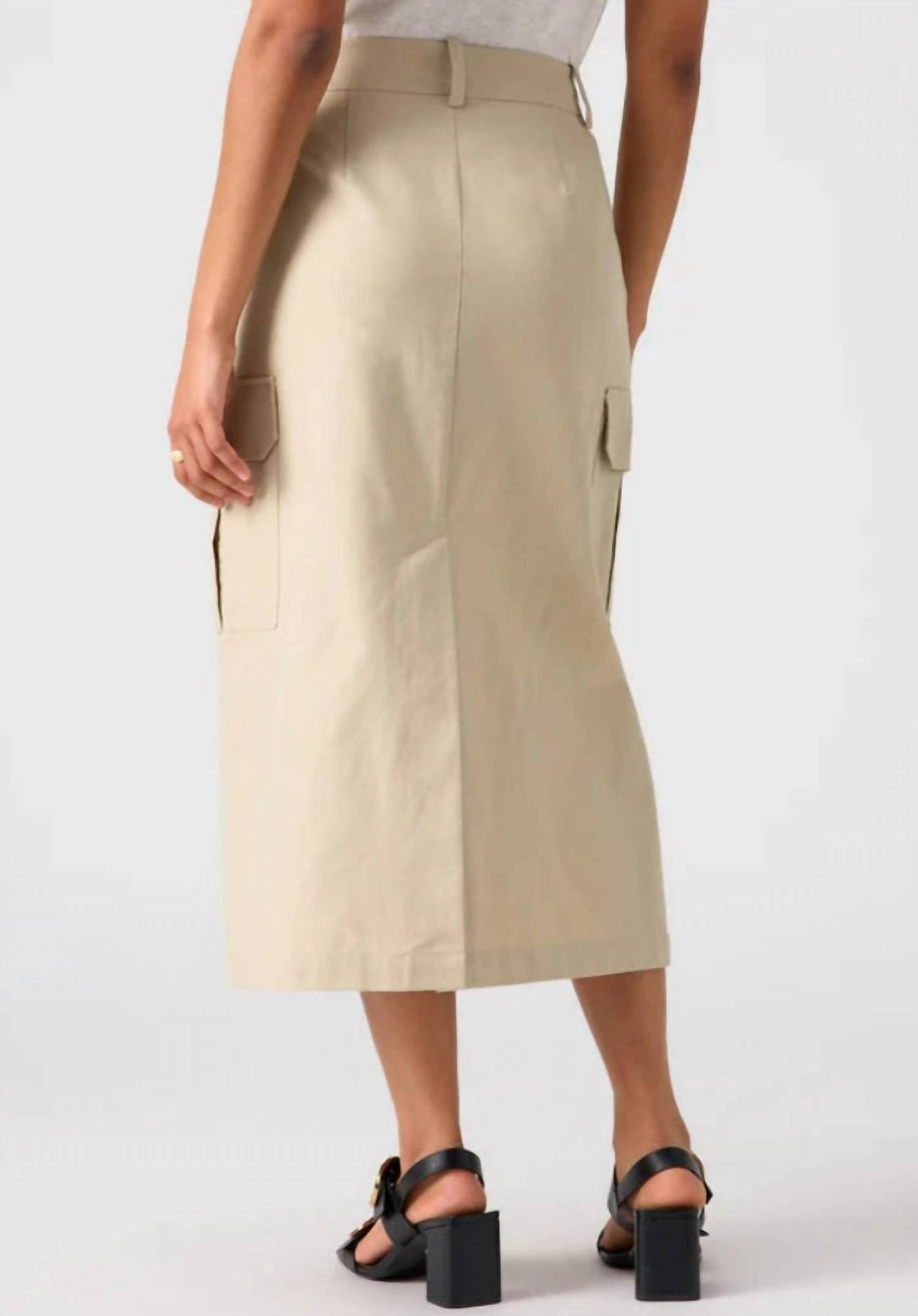 Tuck your favorite tee into this midi length skirt for an effortlessly cool look. Introducing the Beige Essential Cargo Skirt by Sanctuary, perfect for a chic and practical wardrobe addition. This midi-length skirt offers stylish functionality with two front pockets and two side cargo pockets, providing ample storage while maintaining a sleek design. The garment features a semi-high rise with a hook, zipper, and bar closure for a secure fit, complemented by a back slit for added sophistication. Ideal for a Spring holiday party, this women's cargo skirt is designed to keep you effortlessly chic.