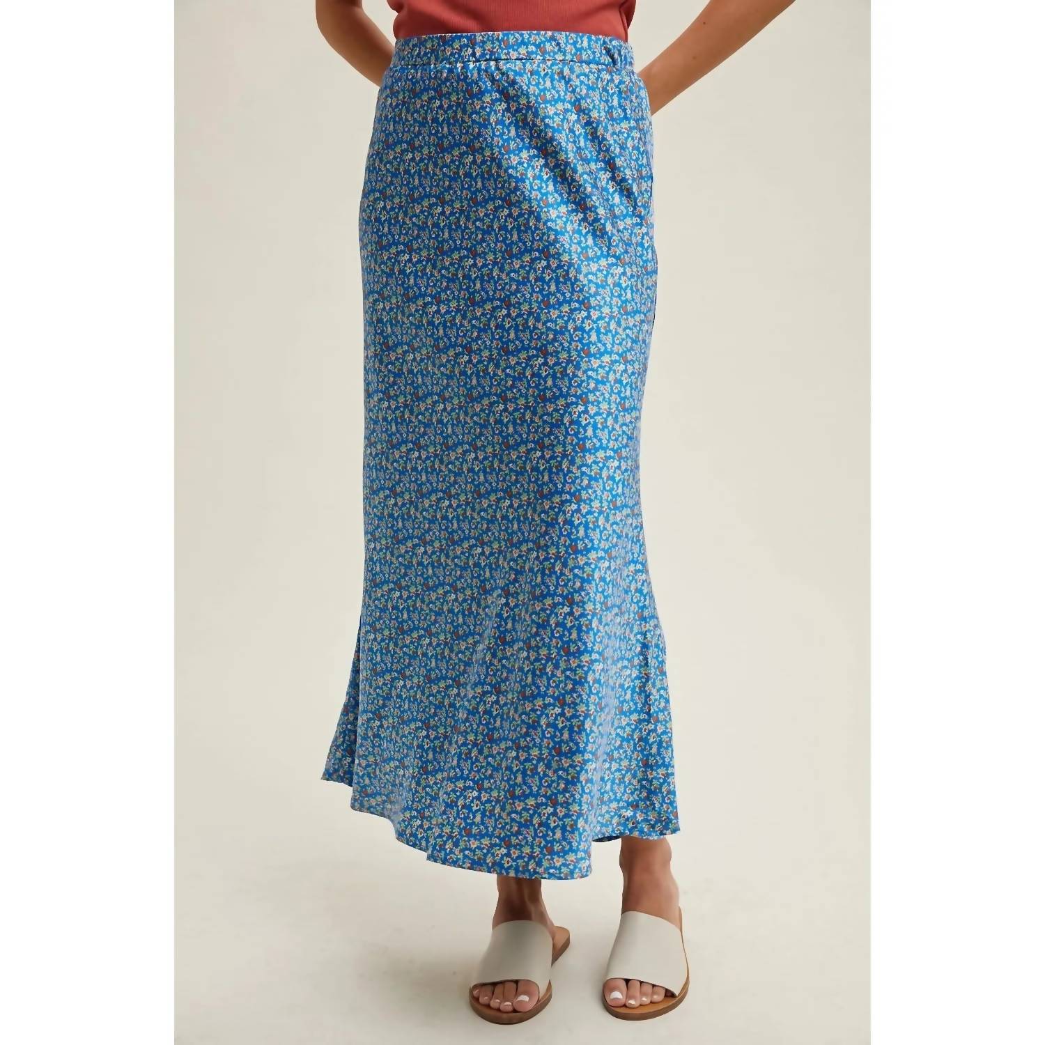 Tuck your favorite tee into this midi length skirt for an effortlessly cool look. Elevate your summer wardrobe with the Amory Midi Skirt by WISHLIST, featuring a captivating blue floral design with rust accents. Crafted in elegant satin, this skirt offers both style and comfort with an elastic waistband. It's a perfect choice for vacation-ready looks. Care: Hand wash and line dry.