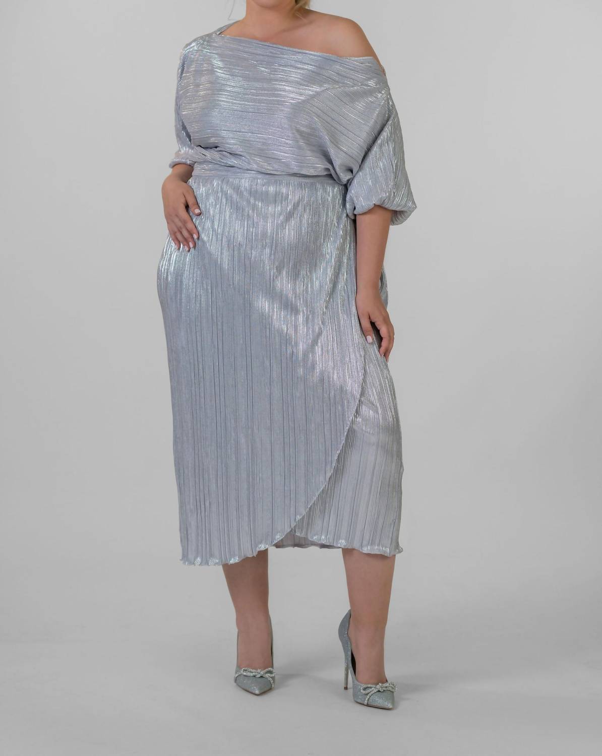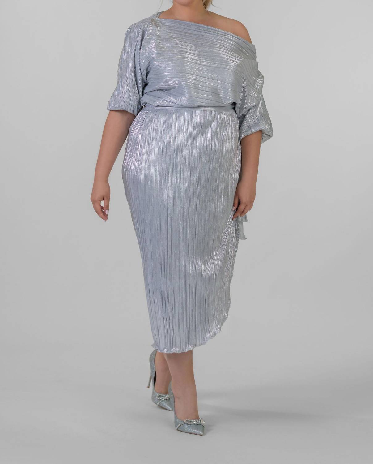 The midi length skirt is here to stay and we especially love this style. Introducing the Silver Plisse Jaspre Wrap Skirt by Never Fully Dressed, a standout piece that combines metallic allure with versatile comfort. This plus-size midi skirt is crafted from 100% Polyester, providing stretch for a perfect fit. It features a pull-on closure, making it easy to wear for various occasions, from holiday parties to casual days. For care, simply hand wash and line dry to maintain its stunning appearance.