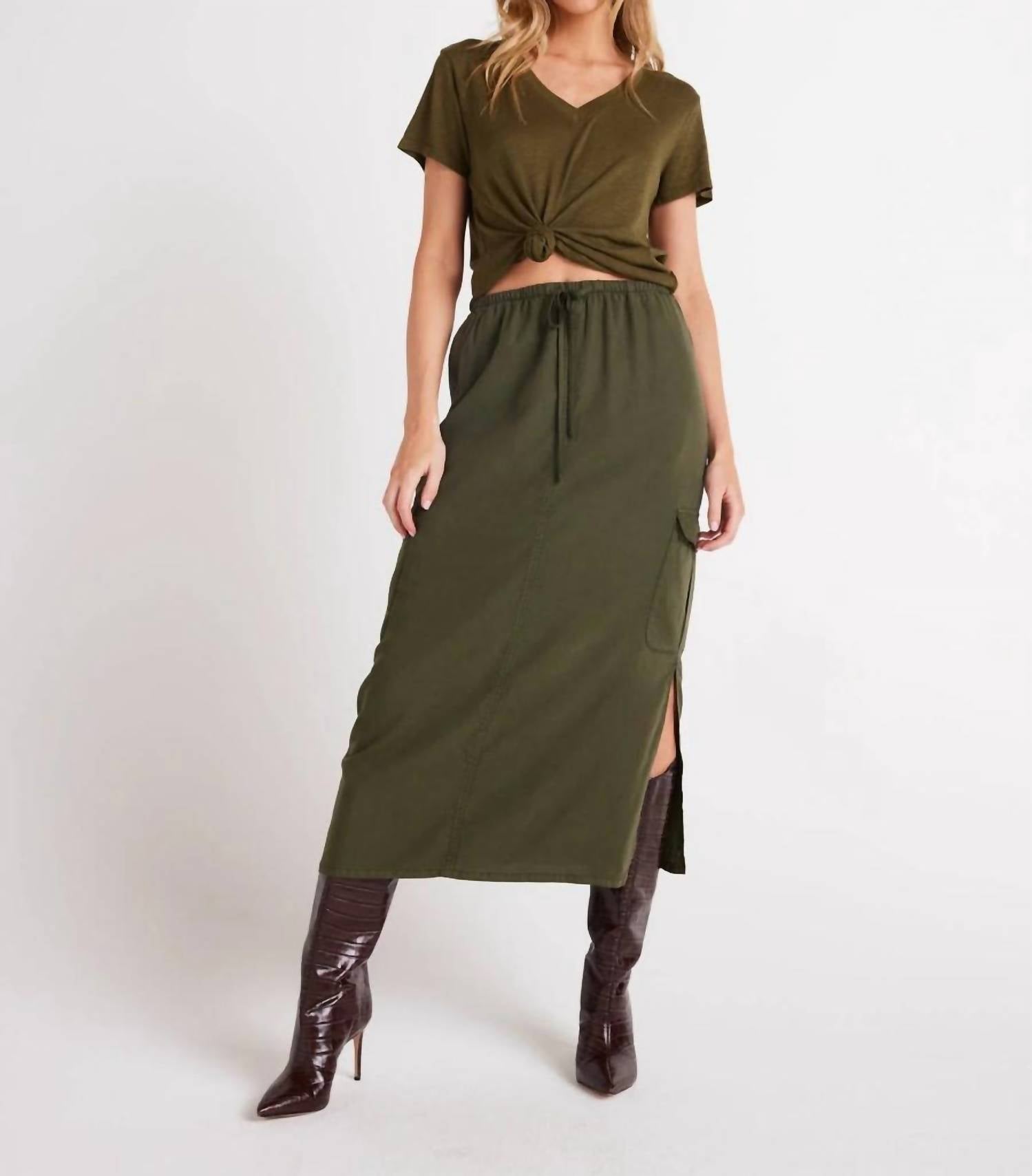 Tuck your favorite tee into this midi length skirt for an effortlessly cool look. The Bella Dahl Cargo Midi Skirt in Italian Herb is the perfect blend of style and utility, crafted from 100% TENCEL™ Lyocell for a luxuriously soft feel. This skirt features practical side cargo pockets and side slits, complemented by an elastic waist for a comfortable pull-on closure. Its midi length makes it versatile for any travel or casual occasion in spring. Care: Machine wash cold for easy maintenance.