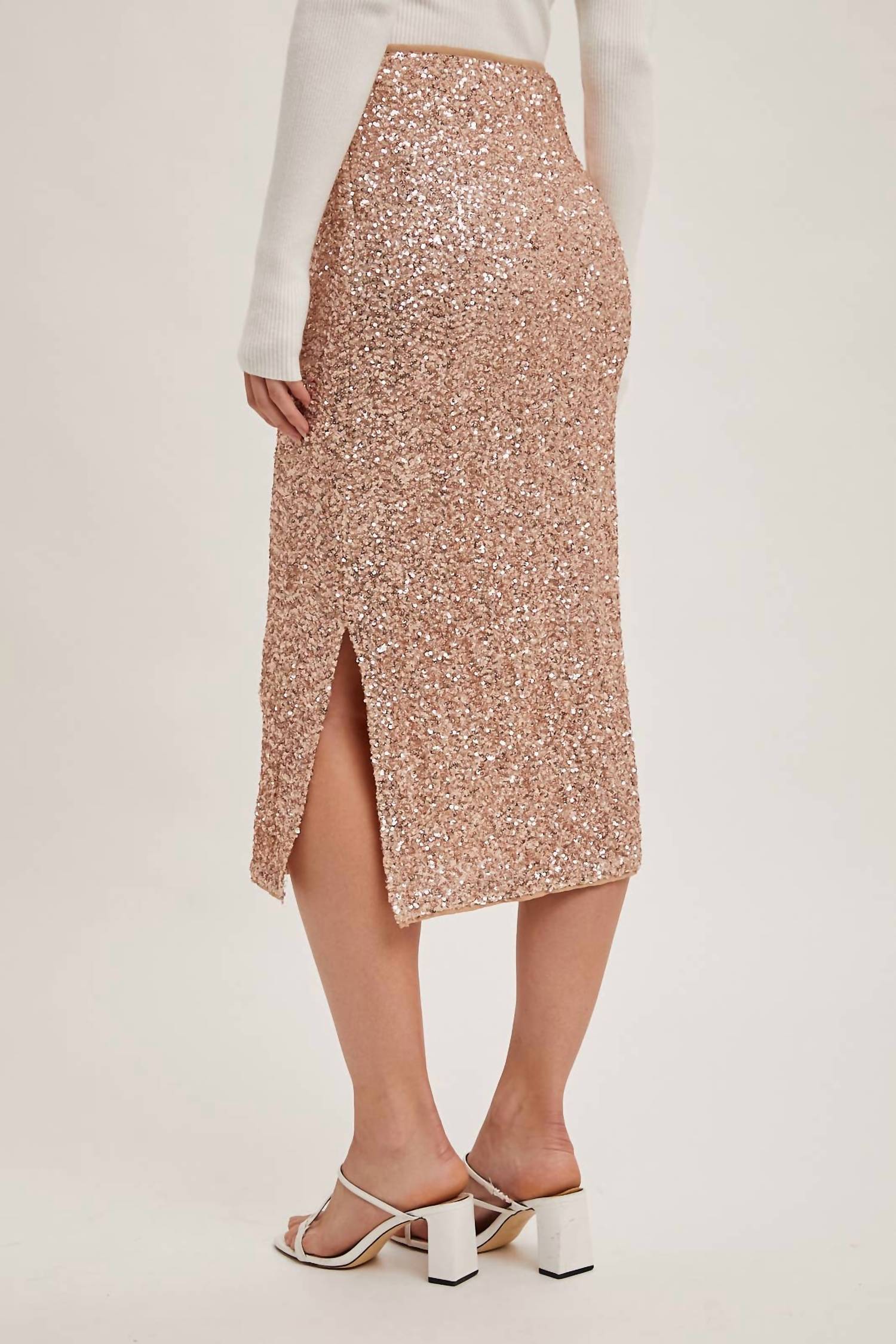 Tuck your favorite tee into this midi length skirt for an effortlessly cool look. Embrace shimmering elegance with the Sequin Midi Skirt by BluIvy in a stunning champagne hue. This eye-catching piece features a textured sequin design that brilliantly captures the light, creating a dazzling effect. With its midi length, it balances sophisticated style perfect for both formal gatherings and festive celebrations. Model is 5'9" and wearing a size small.