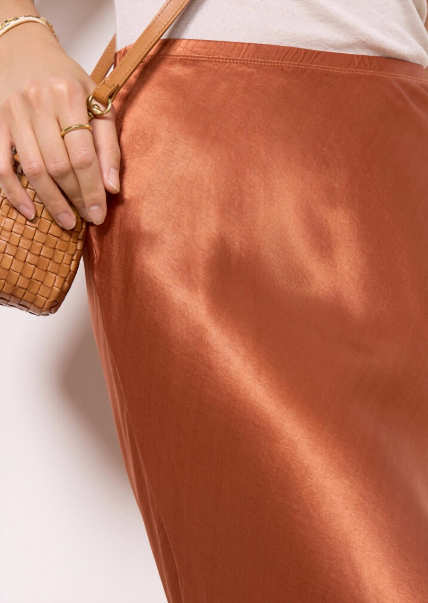 Show off just the right amount of skin in this beautifuly designed midi length skirt. Elevate your wardrobe with the Leila Bias Cut Midi Skirt by Michael Stars, a chic staple in a rich Toffee hue. This 30.5-inch midi skirt is crafted from a luxurious satin blend, consisting of 53% Rayon and 47% Viscose, featuring a flattering bias cut and a comfortable pull-on closure. Made in the USA, it embodies the essence of quiet luxury suitable for fall occasions like Thanksgiving dinner parties. Care is simple with machine wash on a gentle cycle and low tumble dry.
