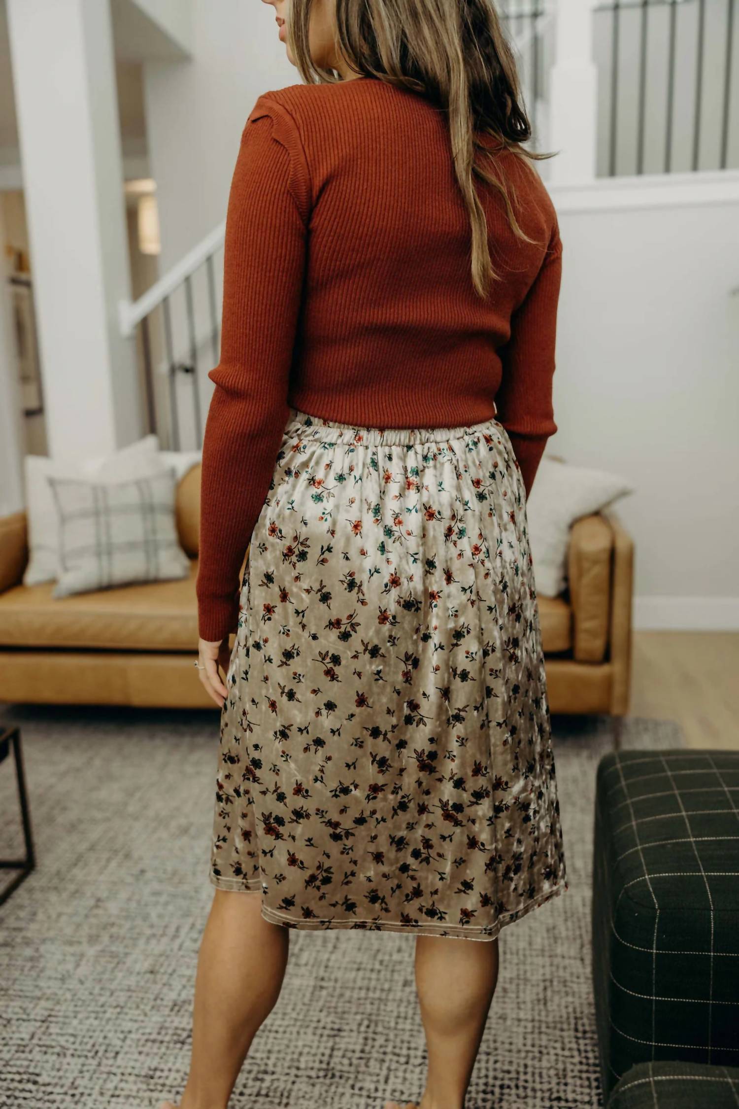 Show off just the right amount of skin in this beautifuly designed midi length skirt. Introducing the Talia A-line Skirt by Mikarose, crafted in soft, stretchy velour with a beautiful floral pattern. This elegant skirt features a knee-length silhouette with an elastic stretch back waist, providing both style and comfort. Made with 95% polyester and 5% spandex, it boasts a charming cream base adorned with rust, green, brown, and peach florals. Its pull-on closure ensures ease of wear, while hand wash and line dry care instructions make it easy to maintain. Ideal for spring vacations and Thanksgiving gatherings, it embodies the quiet luxury trend.