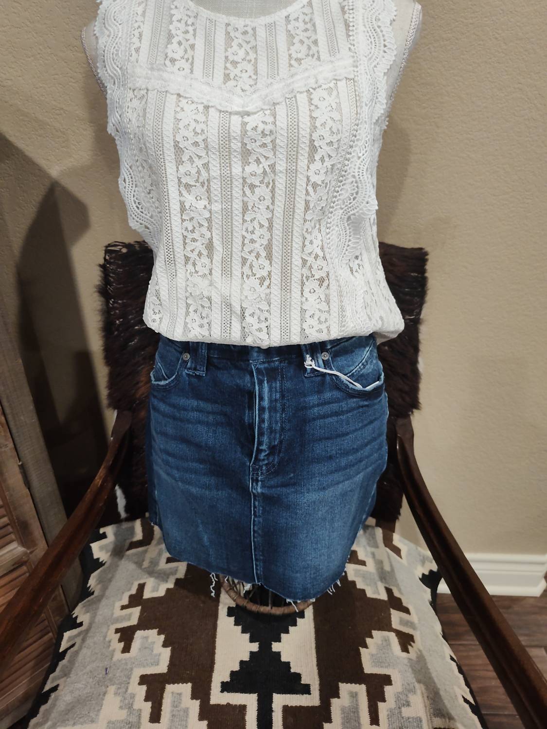 Show off just the right amount of skin in this beautifuly designed midi length skirt. High Rise mini skirt with frayed bottom