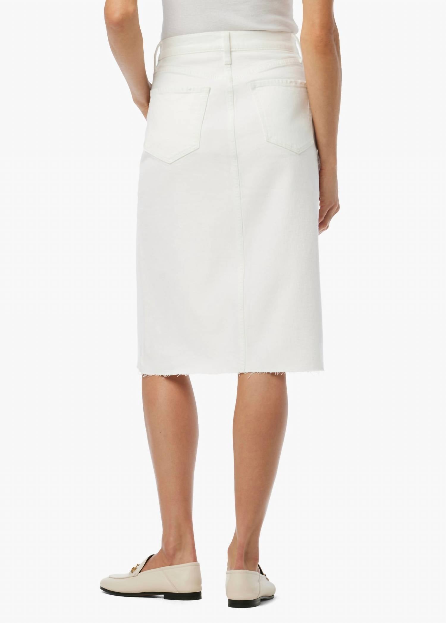Show off just the right amount of skin in this beautifuly designed midi length skirt. Presenting the High Rise Joplin Slit Denim Skirt by Joe's Jeans, a chic addition to your wardrobe in Optic White. This knee-length skirt, designed with a sheath silhouette, features a five-pocket style, front slit detail, and frayed hem for a fashion-forward look. Crafted from a cotton blend of 99% Cotton and 1% Elastane, it offers comfort and a bit of stretch. Closure: Button and zip fly. Care: Machine wash. This imported piece measures 23.5" in length with a 15” waist across size 28.