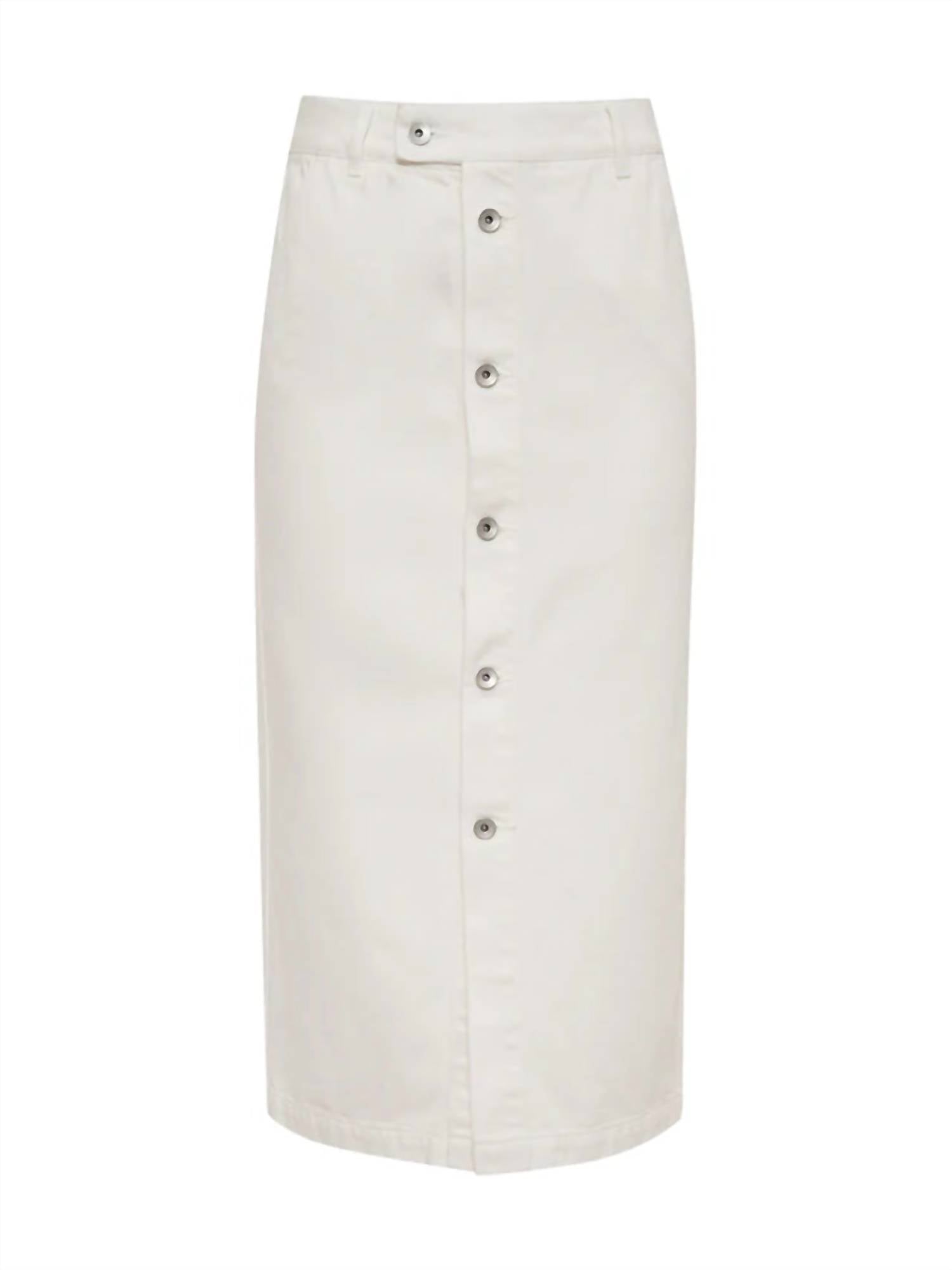 Show off just the right amount of skin in this beautifuly designed midi length skirt. Elevate your ensemble with the Carrier Denim Skirt by Sanctuary, a chic staple for your wardrobe that blends comfort with contemporary style. Made from 100% Cotton, this midi-length skirt in bleached white features a solid pattern and convenient pockets, making it both functional and stylish for any occasion. Closure: Button closure. Care: Machine wash cold, tumble dry low. Model is 5'9" wearing a size 27 with a 30 1/2" waist and a center front length of 30".