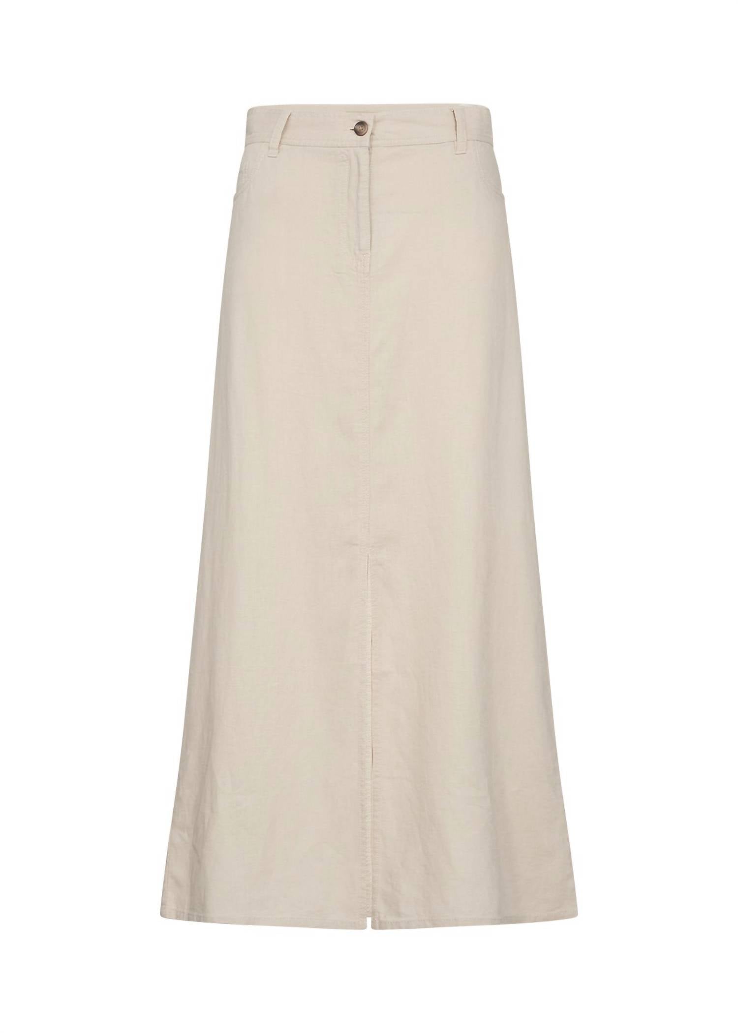 The midi length skirt is here to stay and we especially love this style. Elevate your spring wardrobe with the Soya Concept Ina Linen Skirt, a minimalist and versatile piece in a textured sand finish. Featuring a chic A-line silhouette, it includes five convenient pockets and a stylish front slit, effortlessly combining fashion with functionality. Crafted from a linen blend with 45% viscose and 55% linen, this midi skirt ensures a breathable experience perfect for travel. Closure: Zip fly with button. Care: Hand wash cold, line dry.