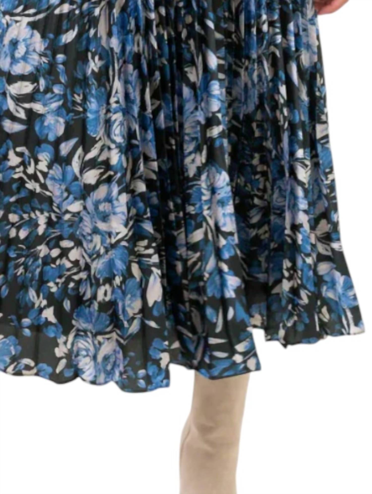 Tuck your favorite tee into this midi length skirt for an effortlessly cool look. Introducing the Parisian Bleu Midi Skirt by LOST + WANDER in a charming blue-floral-multi pattern, a chic addition to any wardrobe. This lined skirt is pleated with a side zipper closure, perfectly combining elegance with functionality. Crafted from 100% polyester with a lining of 97% polyester and 3% spandex, it offers a comfortable fit marked as true to size. Care: Hand wash cold with like colors, line dry, and cool iron if needed.