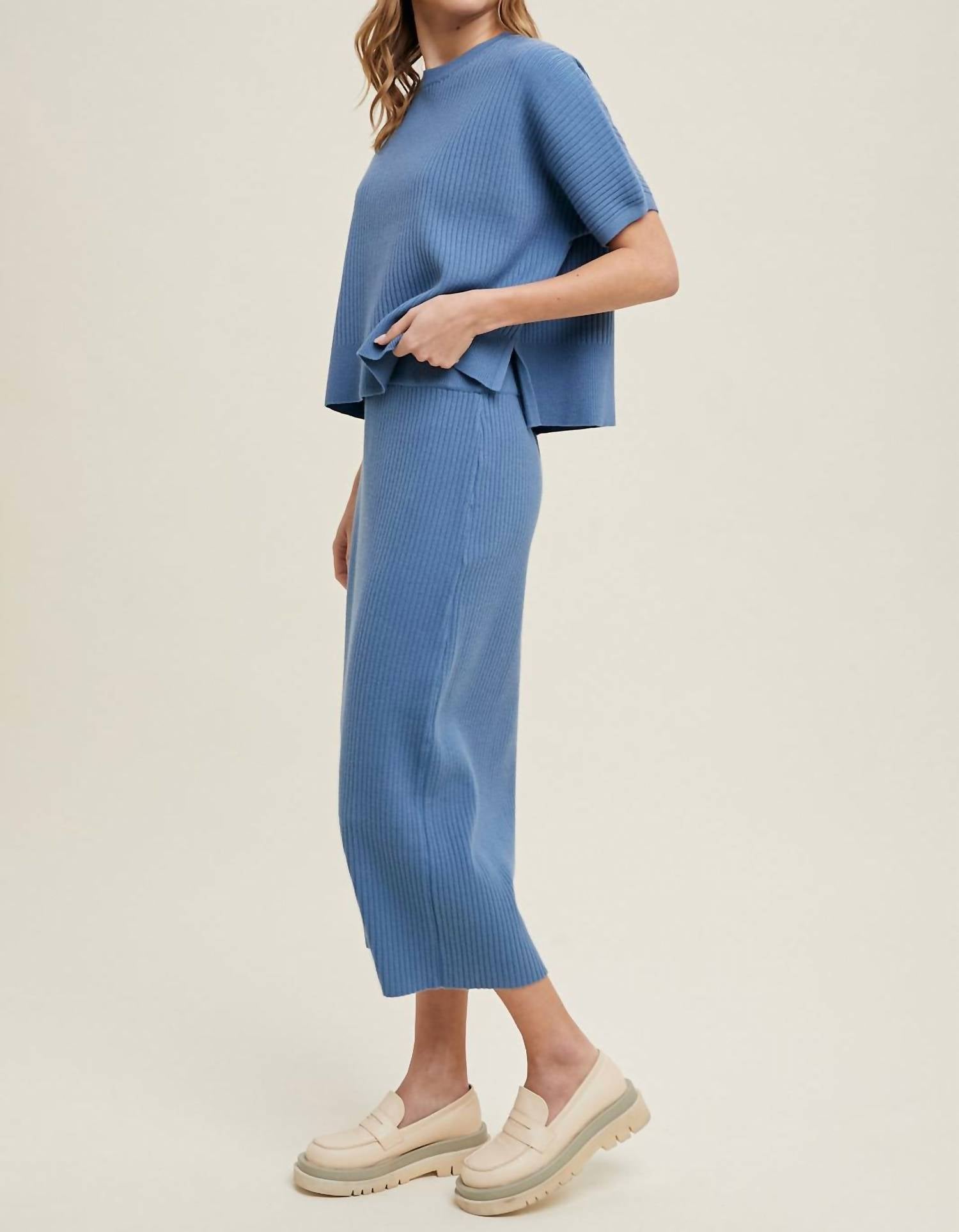 The midi length skirt is here to stay and we especially love this style. Elevate your vacation wardrobe with the Vienna Knit Skirt by WISHLIST, a stylish ribbed midi skirt in Denim Blue. Featuring a straight fit and an elastic waistband, this skirt ensures comfort with a touch of elegance, enhanced by a side slit for added movement. Crafted from a viscose blend that includes 50% Viscose, 28% Polyester, and 22% Nylon, this skirt is a textured masterpiece perfect for springtime adventures. Closure: Pull-on. Care: Hand wash to maintain its sleek design. With waist measurements of 28" for S, 30" for M, and 32" for L, and length varying from 32" to 33", this piece pairs effortlessly with the Vienna Knit Top for a monochrome ensemble.