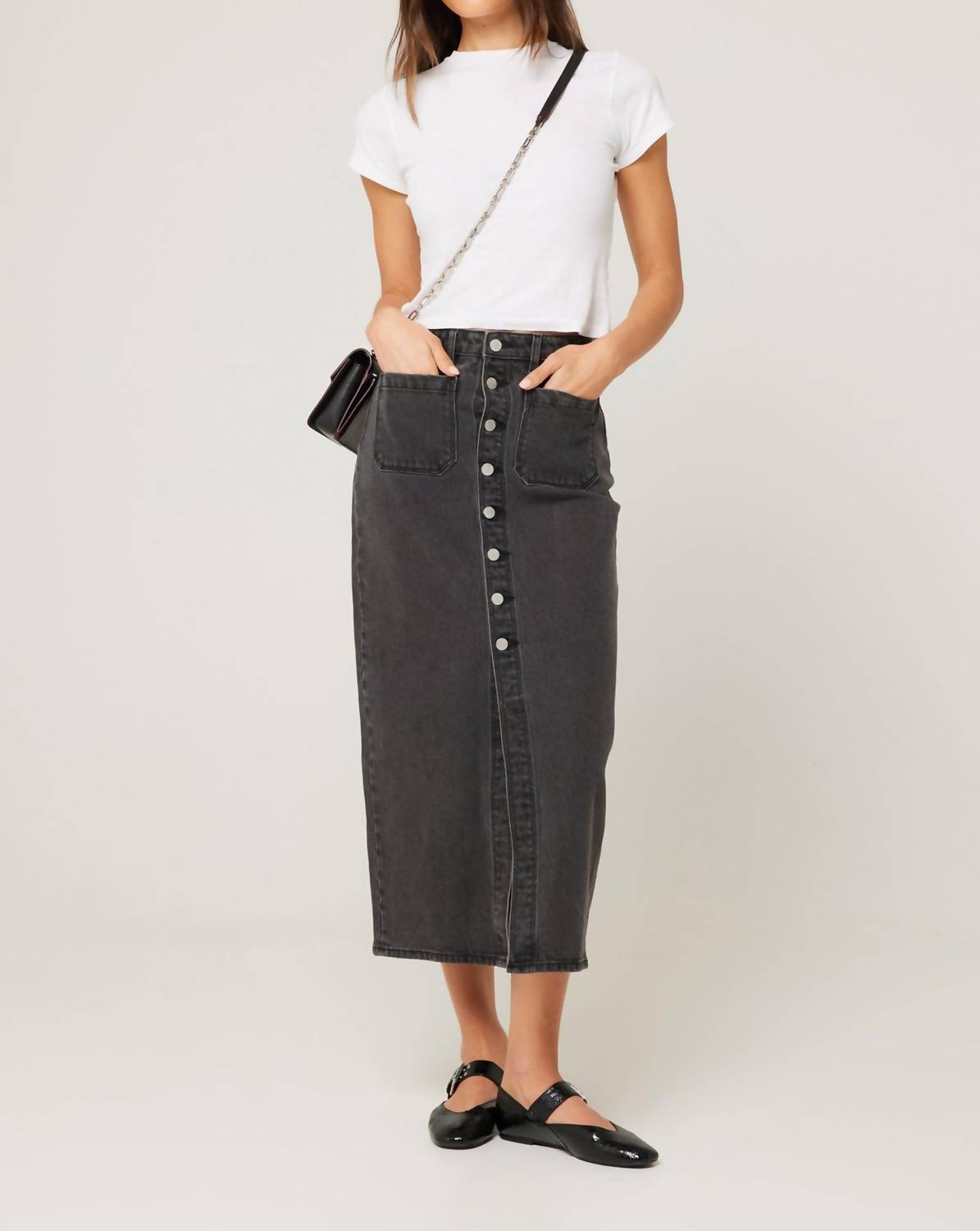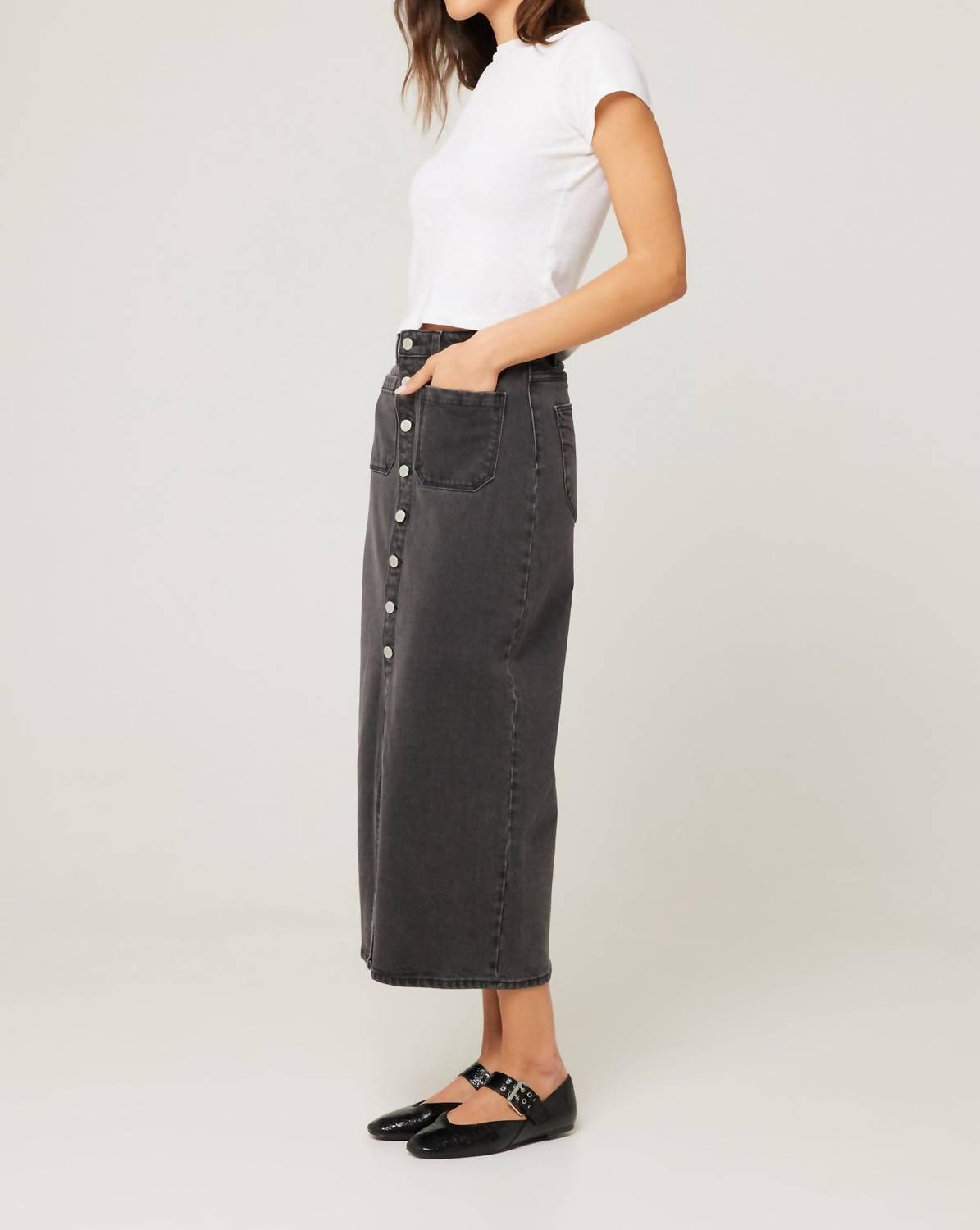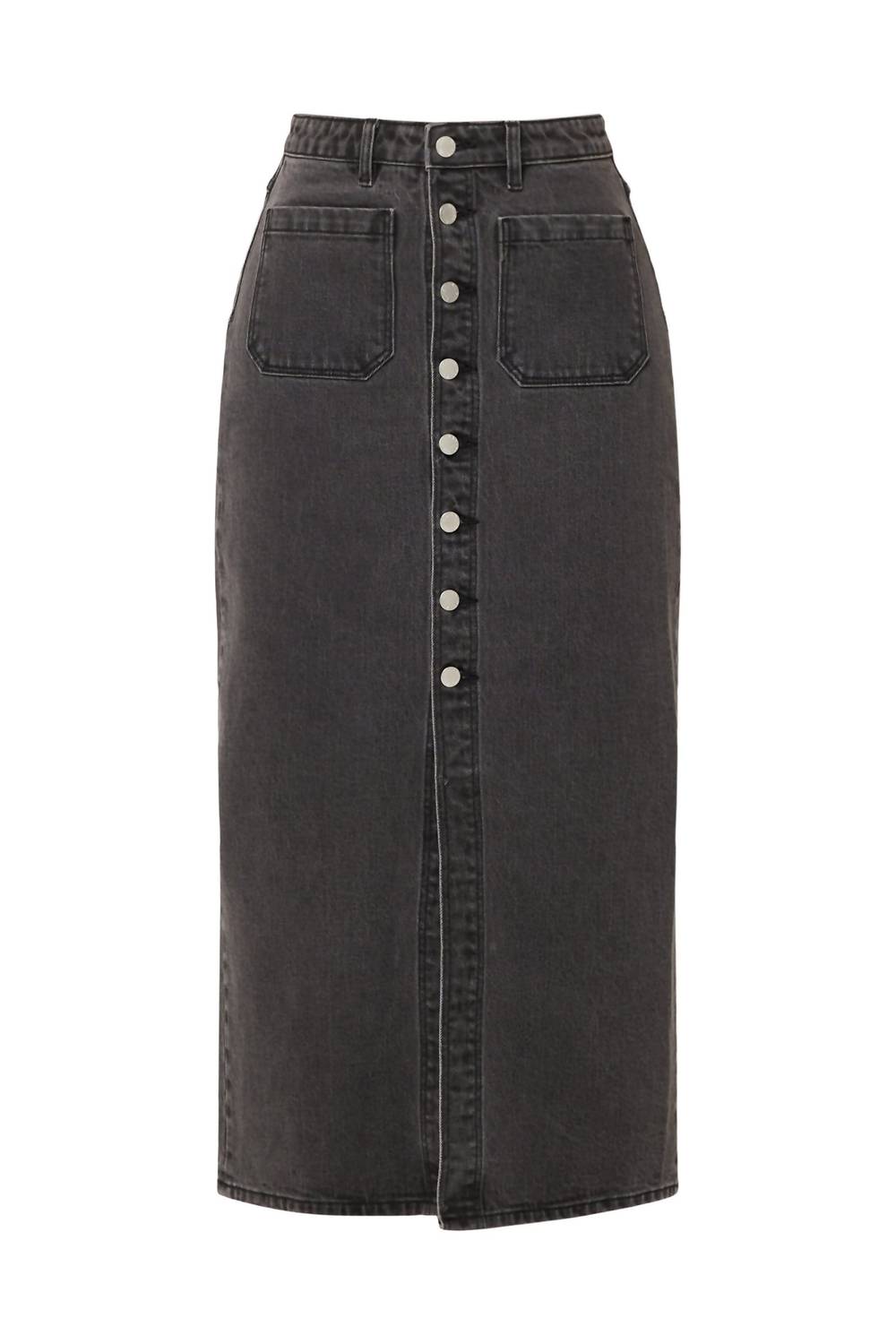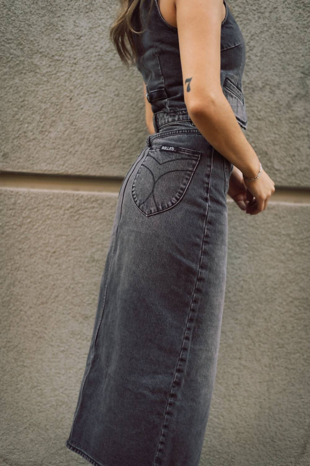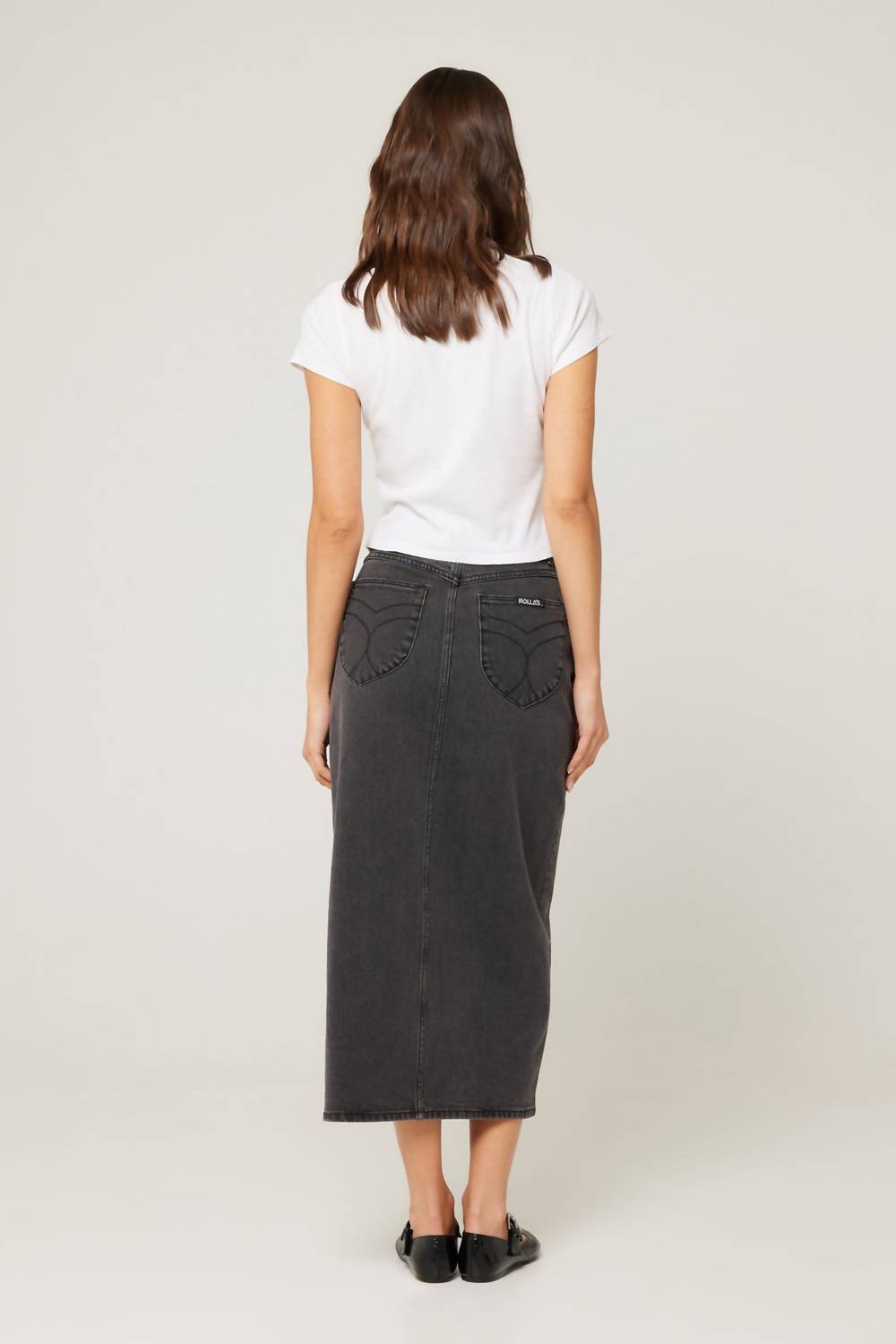 Show off just the right amount of skin in this beautifuly designed midi length skirt. Introducing the Sailor Denim Midi Skirt by ROLLA'S, a must-have for your spring streetwear collection. This high-rise, slim-fitting long skirt is crafted from 100% cotton and features a sophisticated faded black hue with tonal stitching. Its design includes sailor front patch pockets, signature back pockets, and Rolla's vintage logo buttons, making it as functional as it is stylish. Made from rigid, non-stretch denim, this piece has a button-through front opening. Care is simple with machine wash and tumble dry instructions, perfect for travel and Easter getaways.