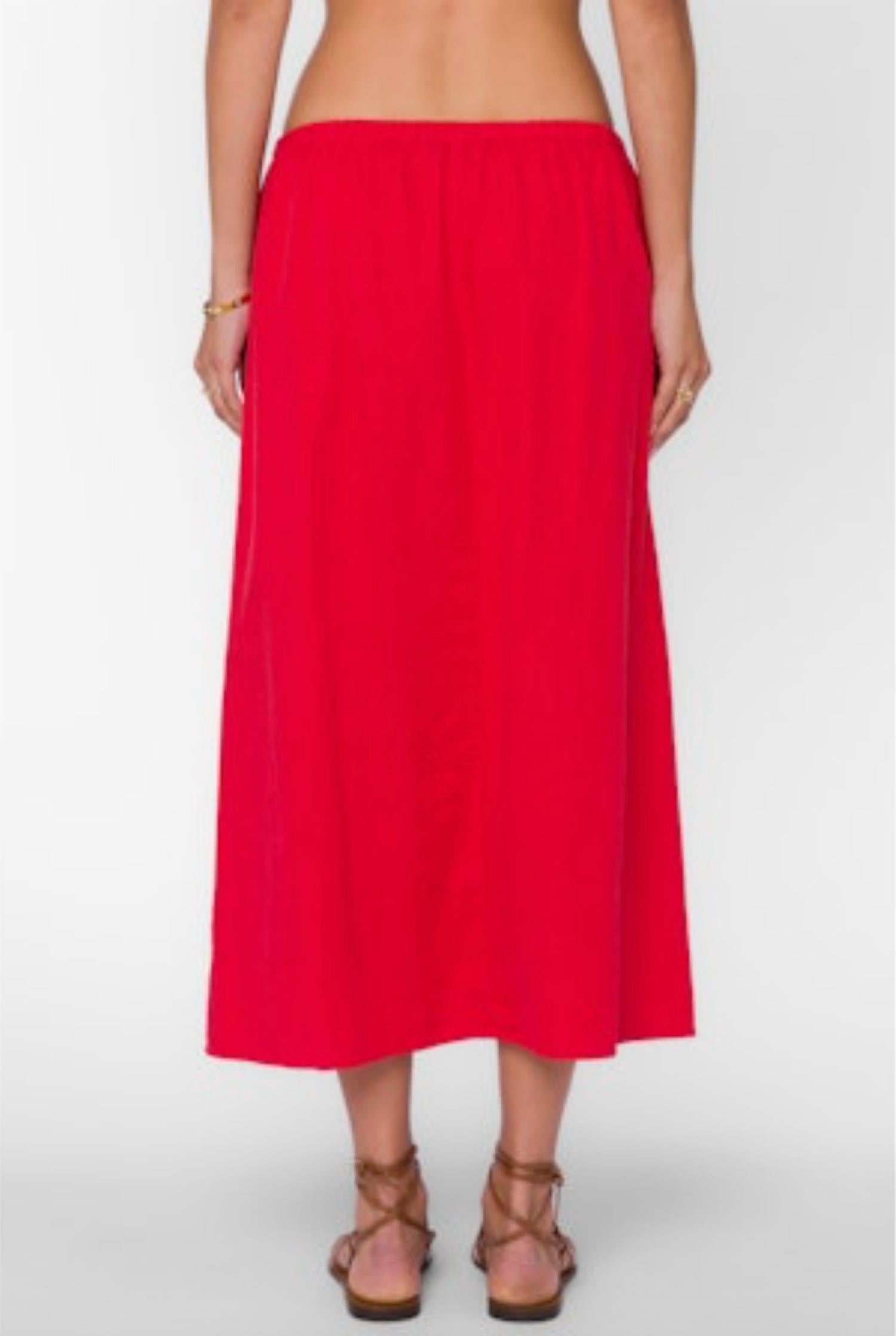 Show off just the right amount of skin in this beautifuly designed midi length skirt. Introducing the Women's Fiona Linen Blend Pull On Skirt by Velvet Heart, a chic and versatile midi skirt perfect for a minimalist summer wardrobe. Crafted from a luxurious linen blend composed of 70% Linen and 30% Viscose, this skirt boasts a vibrant cherry red color and is thoughtfully designed for vacation wear with an effortless pull-on elastic waist for comfort. Its solid pattern and flowy silhouette make it an ideal choice for a stylish getaway, while its easy-care machine washable feature adds practicality to its appeal.