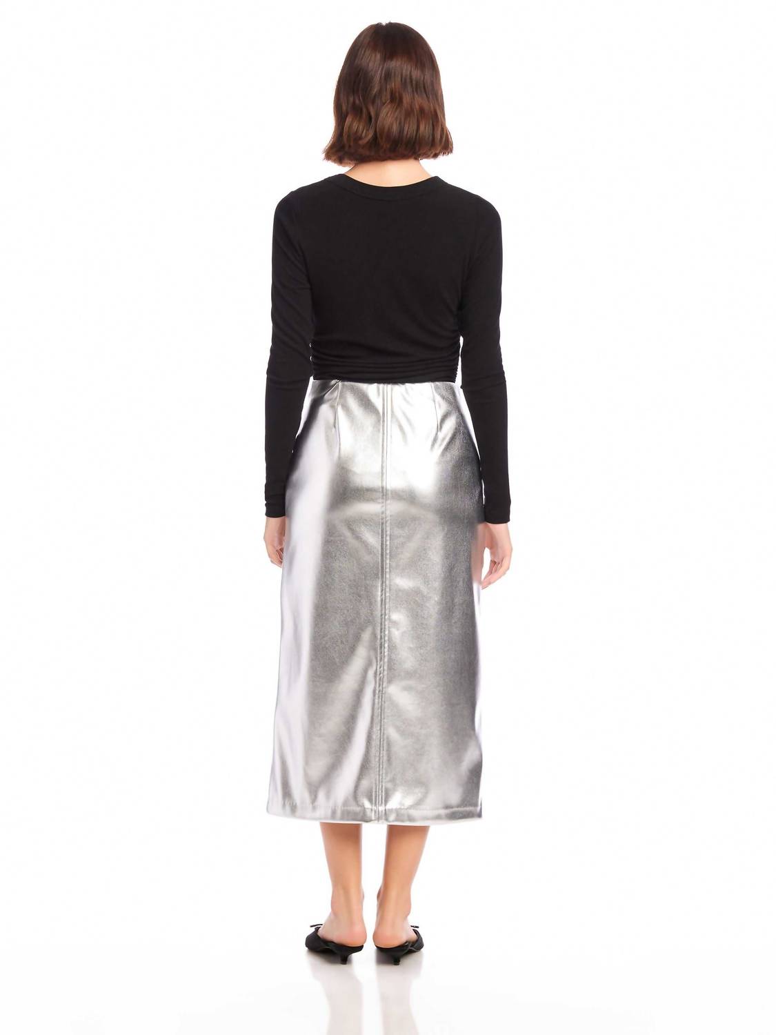 Show off just the right amount of skin in this beautifuly designed midi length skirt. Elevate your evening wardrobe with the Kaia Faux Leather Front Slit Midi Skirt by Fifteen Twenty, a stunning silver piece perfect for any holiday party or night out. Crafted from 100% metallic faux leather, this imported skirt features a chic pencil silhouette with a 32.5-inch midi length and a sophisticated front slit. It secures with a convenient zip closure and embodies the quiet luxury trend that effortlessly complements any ensemble. Care is simple: wipe clean with a damp cloth, hang to dry, and avoid dry cleaning to maintain its sleek look.