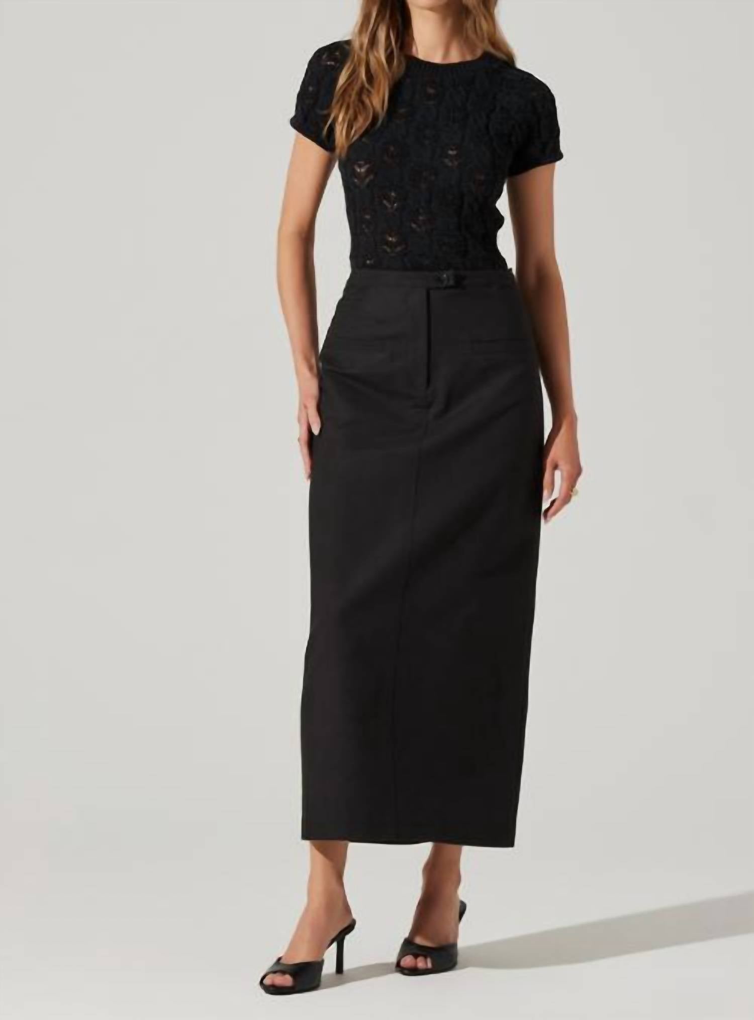 The midi length skirt is here to stay and we especially love this style. The Sibley Midi Skirt by ASTR is a minimalist staple perfect for fall occasions. Designed in a solid black color with a zip closure, it pairs effortlessly for Thanksgiving dinner parties. This women’s midi skirt emphasizes elegant simplicity with its structured silhouette. Made for a fashionable statement, it requires dry cleaning for care.