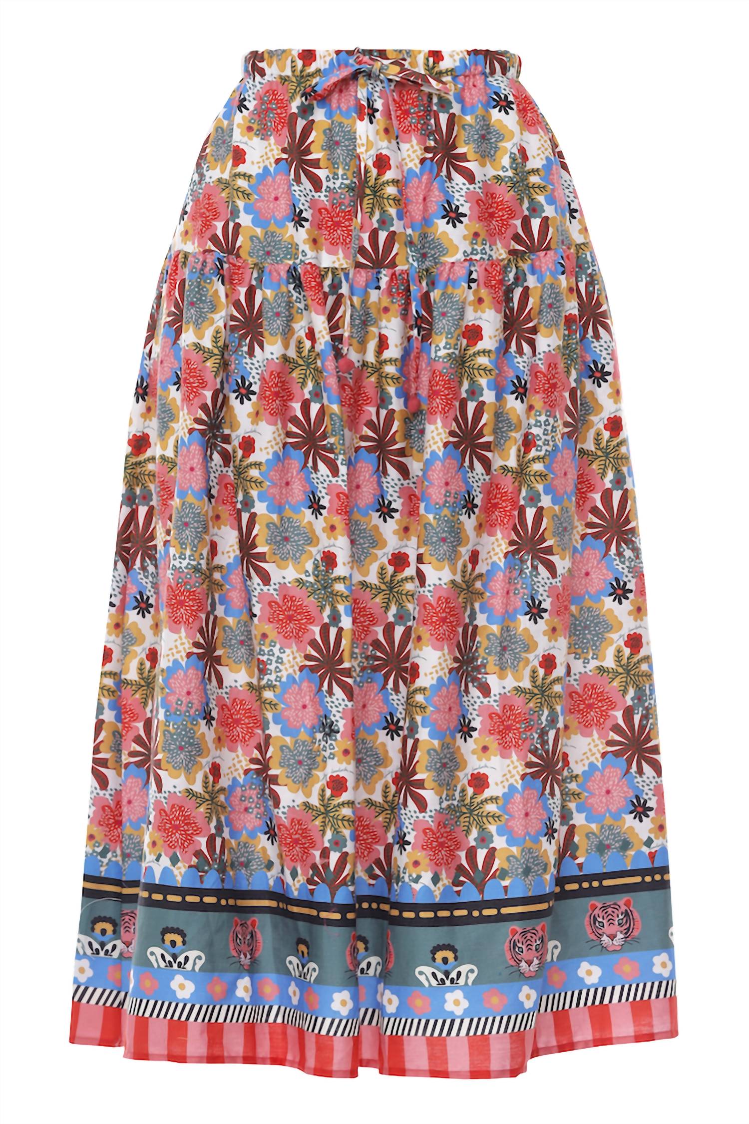 Who doesn’t love HEIDI Midi skirt from Emily Lovelock in this stunning border floral print. It's the perfect way to brighten your everyday style. Sneakers and your favorite tee is really all you need to complete this favorite. OR match to the Emma white tiger print blouse COTTON TENCEL-SATIN