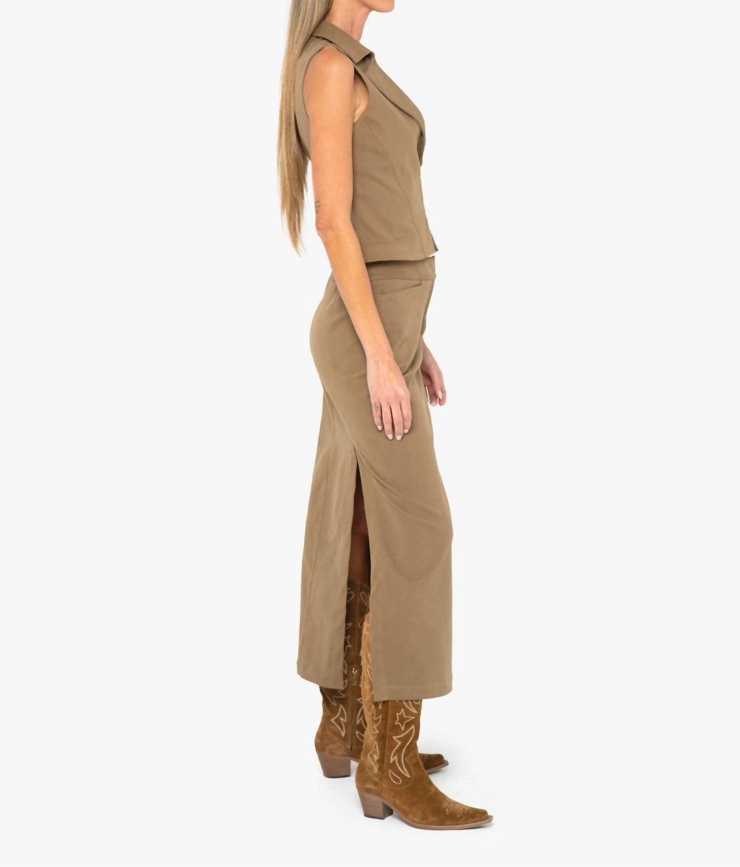 The midi length skirt is here to stay and we especially love this style. Introducing the Aura Midi Skirt by JBQ, a chic minimalist piece in a versatile taupe color, perfect for a dinner party setting. Crafted from a comfortable cotton blend composition of 94% cotton and 6% spandex, this skirt offers a flattering mid-rise waistband and a straight silhouette that falls elegantly from hip to hem. Featuring front slip pockets and back slits for added style, it includes a discreet hidden hook and zip fly closure. Made in the USA from imported materials, this skirt is easy to care for with a cold wash and line dry instructions. Model is 5'9" and wearing a size small.