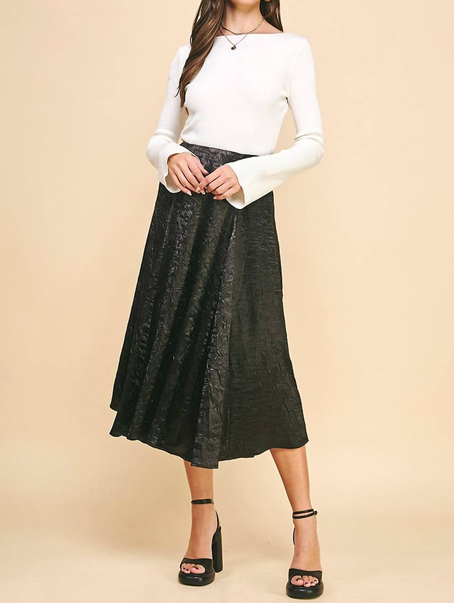 Tuck your favorite tee into this midi length skirt for an effortlessly cool look. Discover the Sloan Midi Skirt by PINCH, a chic addition to your wardrobe with its smooth, shimmery fabric and crinkle texture that captures the essence of minimalist fashion. Crafted from 100% Polyester, this fit and flare style skirt features a sleek zip closure and is presented in an elegant black hue perfect for winter. Its mid-length design enhances versatility, making it suitable for various occasions. Hand wash as needed.