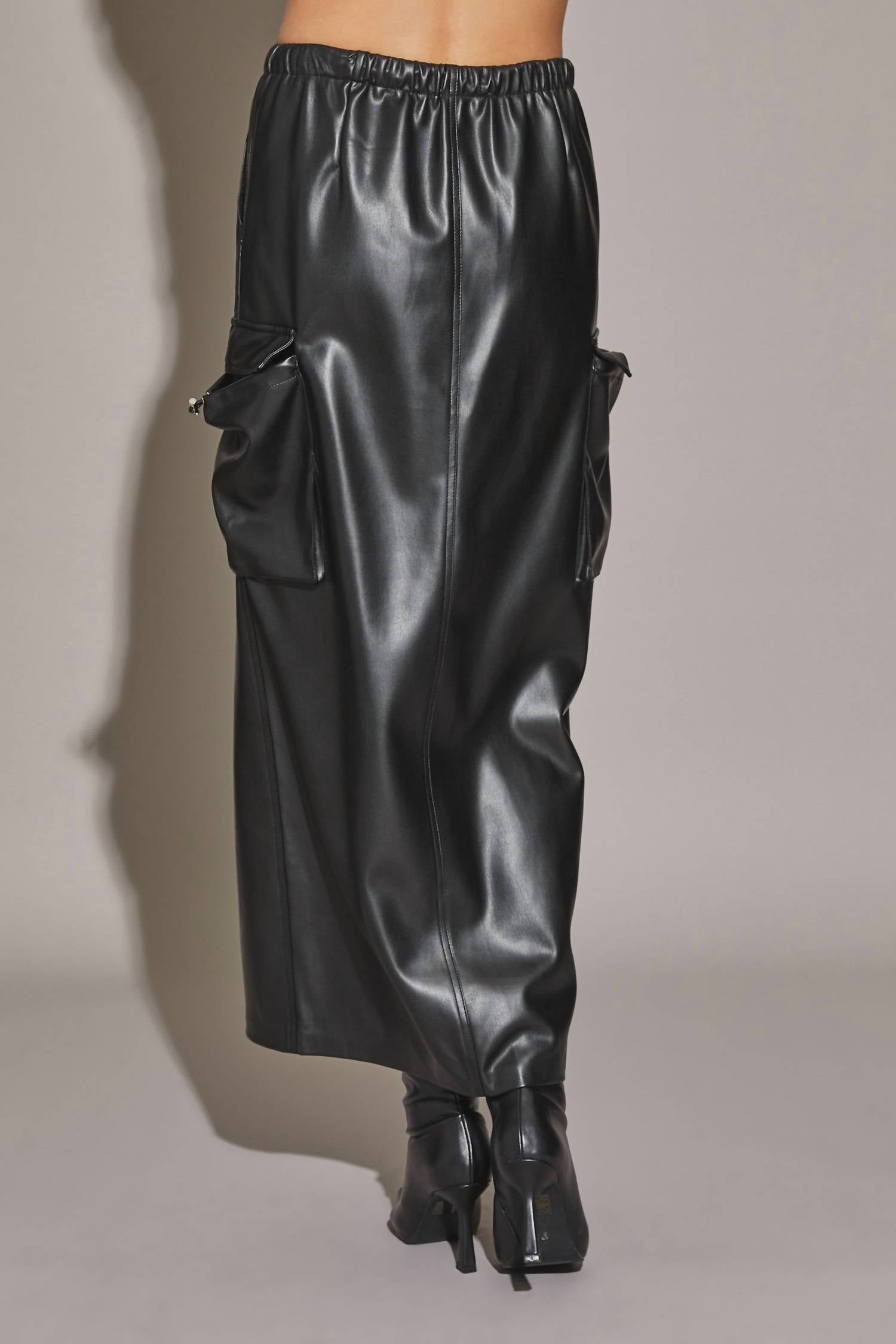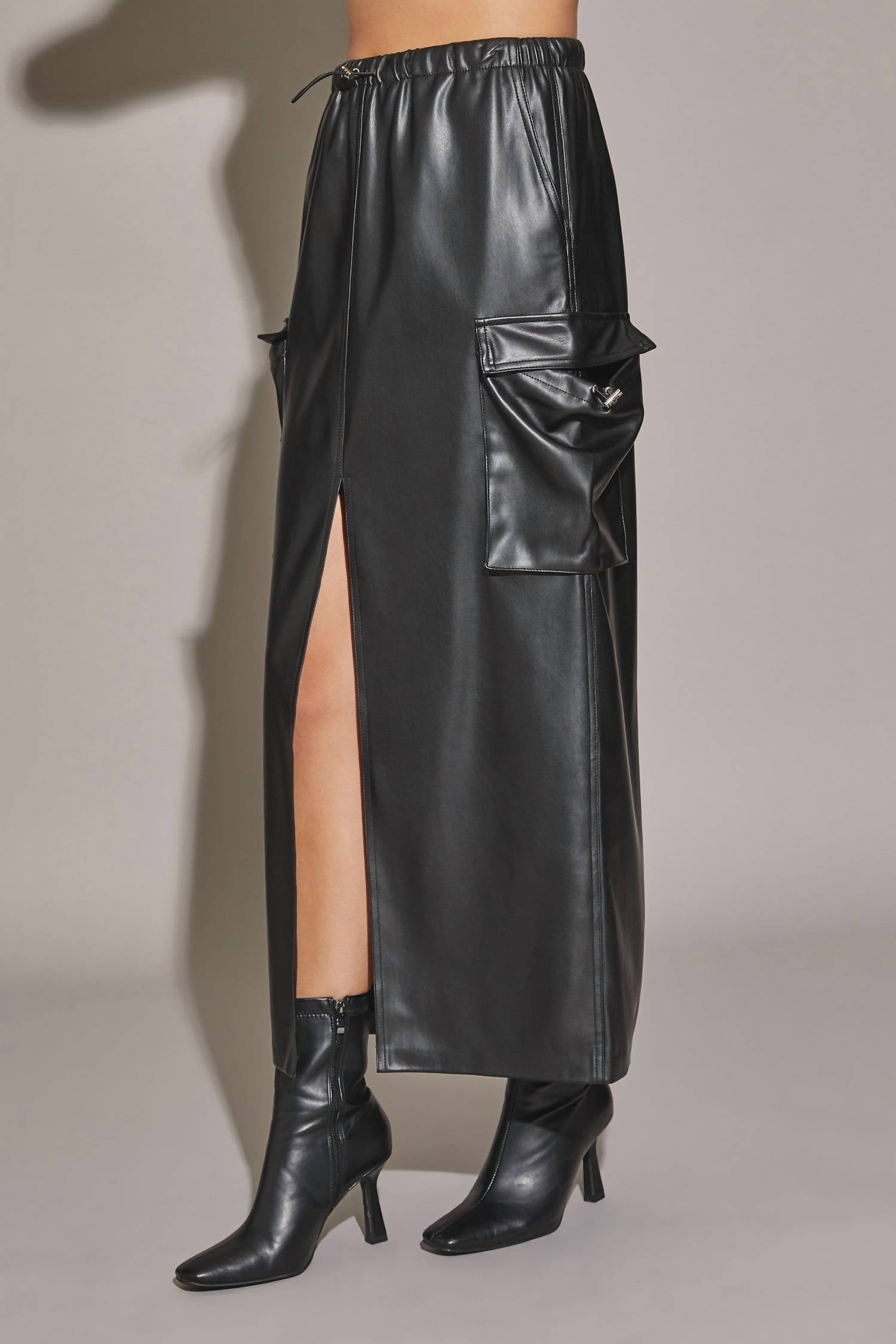 Show off just the right amount of skin in this beautifuly designed midi length skirt. Experience the sleek sophistication of the CORRIE SKIRT by Mustard Seed with its contemporary design. Crafted in black polyurethane, this solid-patterned midi skirt is as durable as it is fashionable. The cargo style offers practical pockets and is finished with a tie closure for a customizable fit. Perfect for various occasions, this leather-inspired piece is a lasting addition to any wardrobe.