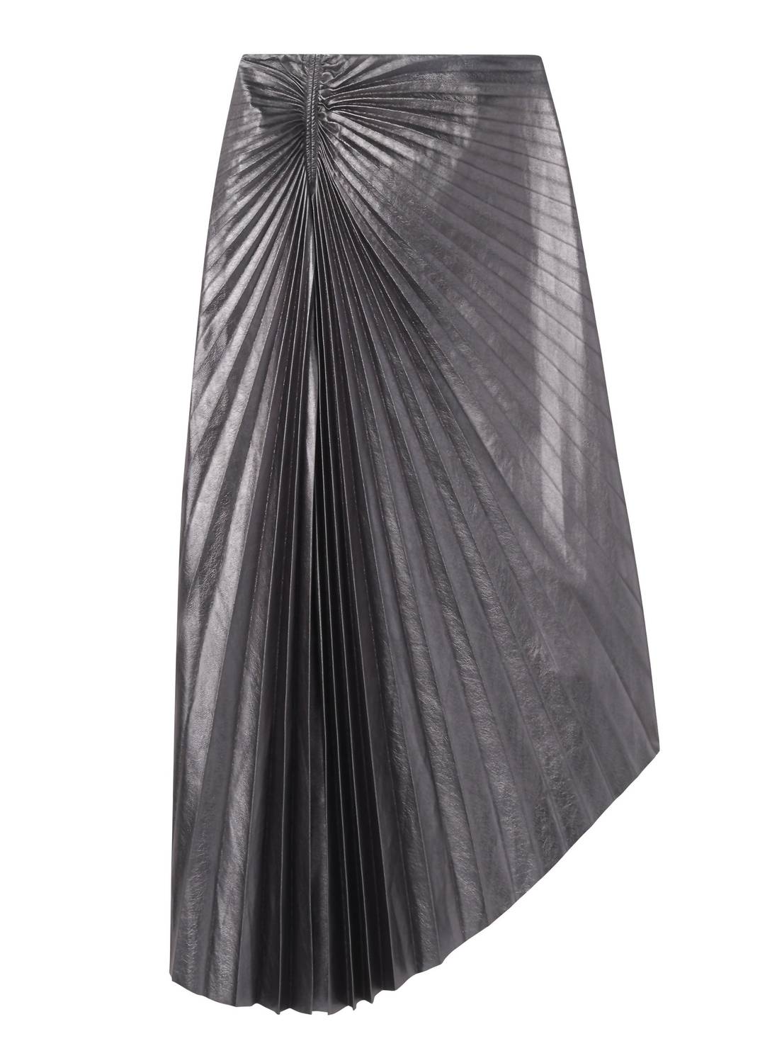 The midi length skirt is here to stay and we especially love this style. The Women's Tracy Vegan Skirt by A.L.C. is a statement piece in slate metallic that's perfect for evening events. This midi skirt boasts dramatic sunburst pleats and ruched hip detailing, crafted from 100% polyester with a 100% polyurethane coating, offering a sculptural aesthetic and fluid movement. Featuring a side zipper closure and a fishtail hem for an asymmetric touch, it measures 39.25" in length. Model is 5'11", wears size 2, with measurements of bust 30", waist 23", hips 34.5". Additional size 4 measurements: waist 29", hips 39".