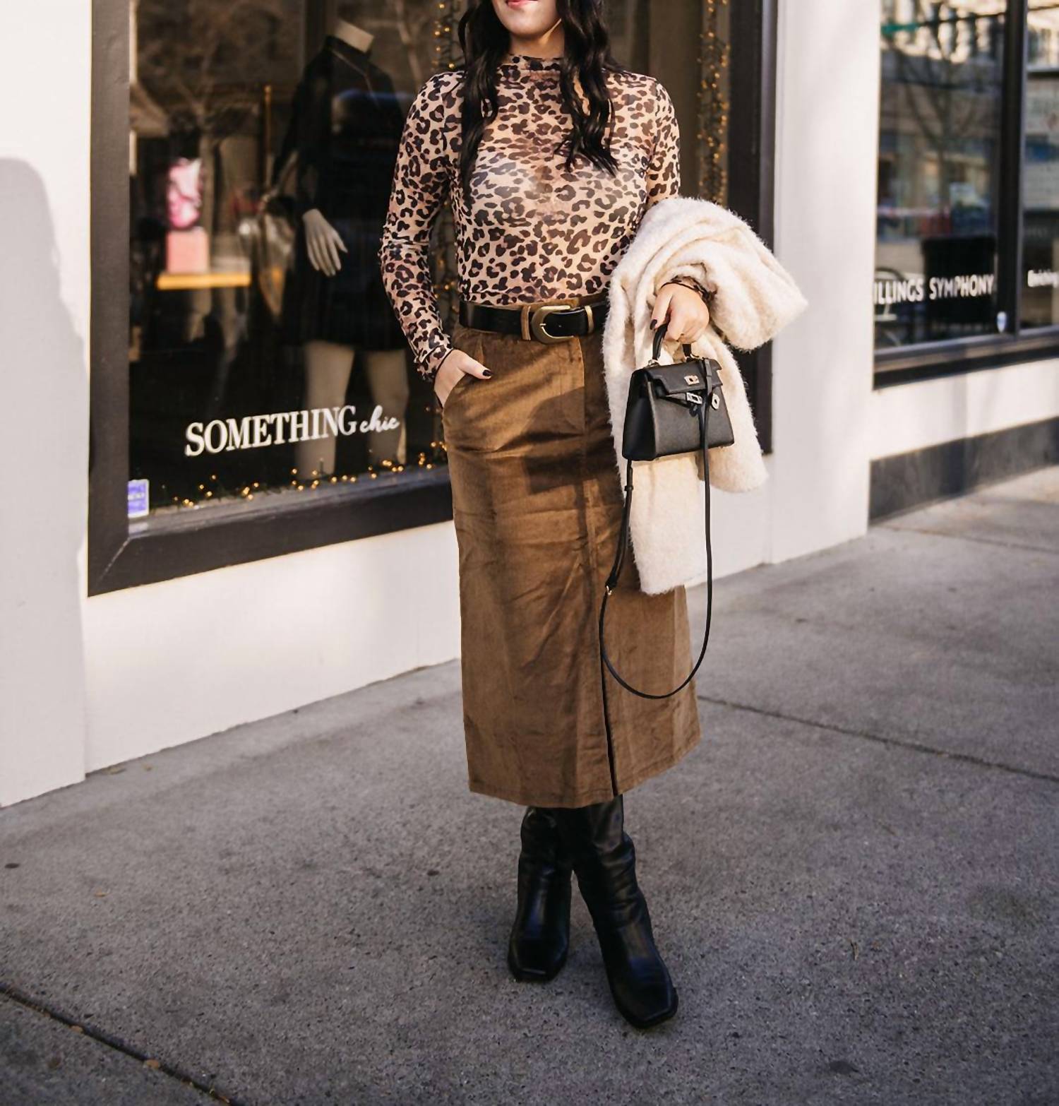 Tuck your favorite tee into this midi length skirt for an effortlessly cool look. Elevate your style with the Corduroy Midi Skirt by ASTR, expertly crafted from a luxe, fine-wale corduroy blend of 98% Cotton and 2% Elastane for a soft, velvety texture. This brown skirt is designed with a high-rise, streamlined silhouette, functional belt loops, side pockets, and a front slit for ease of movement. The concealed front zipper and hook closure add a refined touch to your ensemble. Perfect for spring holiday parties, this skirt fits true to size, as modeled by Kali in a medium.