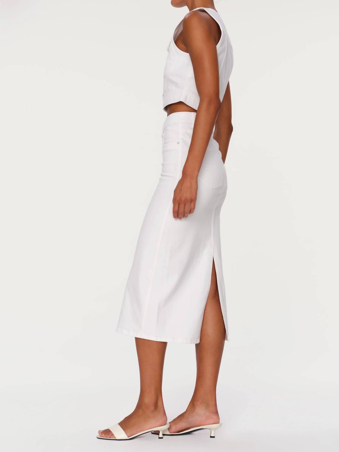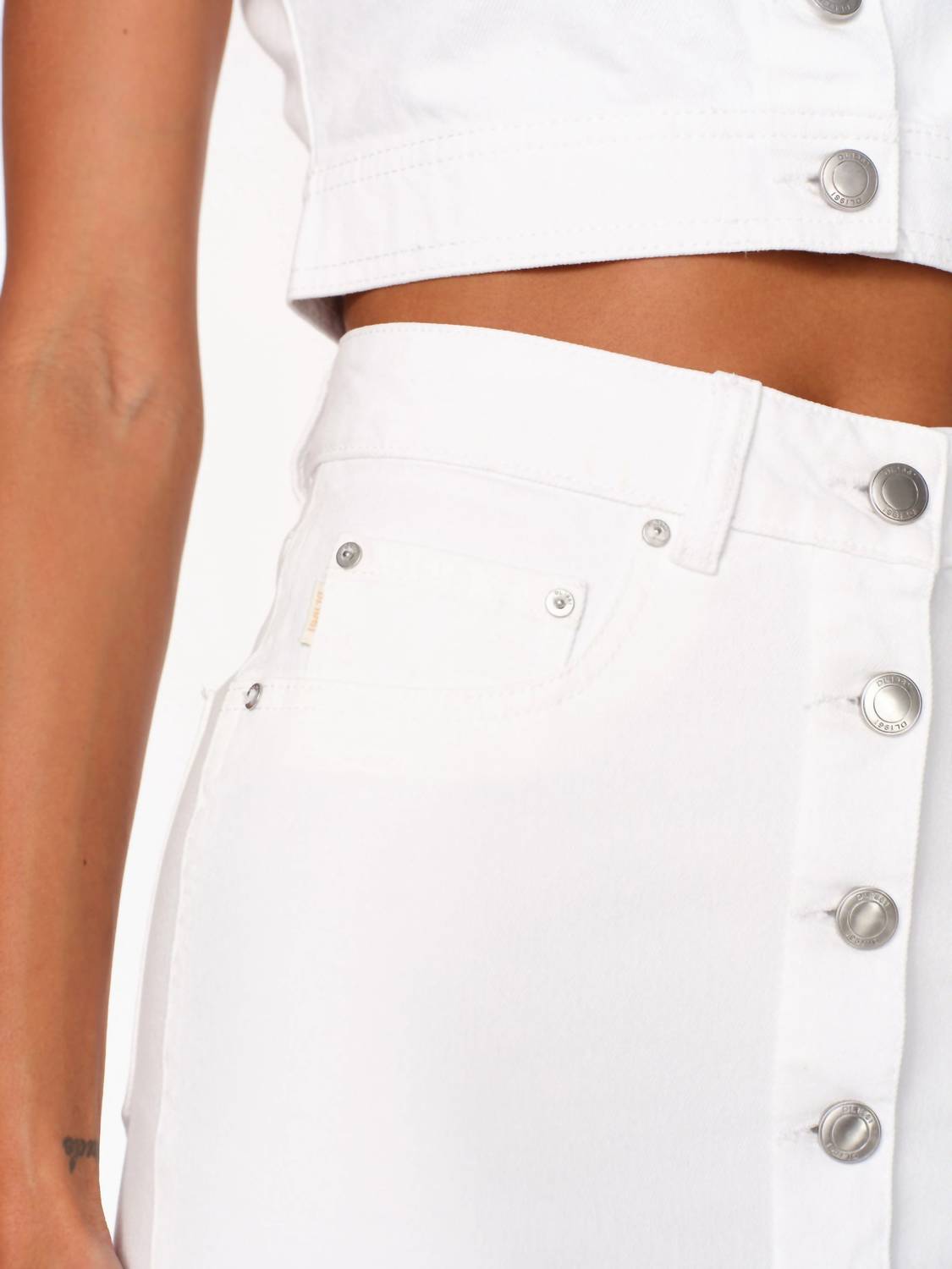 The midi length skirt is here to stay and we especially love this style. The DL1961 Women's Lexie High Rise Denim Skirt is a summer staple with its chic, minimalist design in fresh white. This knee-length skirt features a high-waisted fit and a button-front closure, exuding effortless style with its solid pattern and subtle silver hardware. Made from a comfortable cotton blend (99% cotton, 1% lycra), it offers a slight stretch for a flattering fit with dimensions: Skirt length 21". Care is easy with machine wash and tumble dry instructions, making it perfect for back-to-school or any warm-weather occasion.