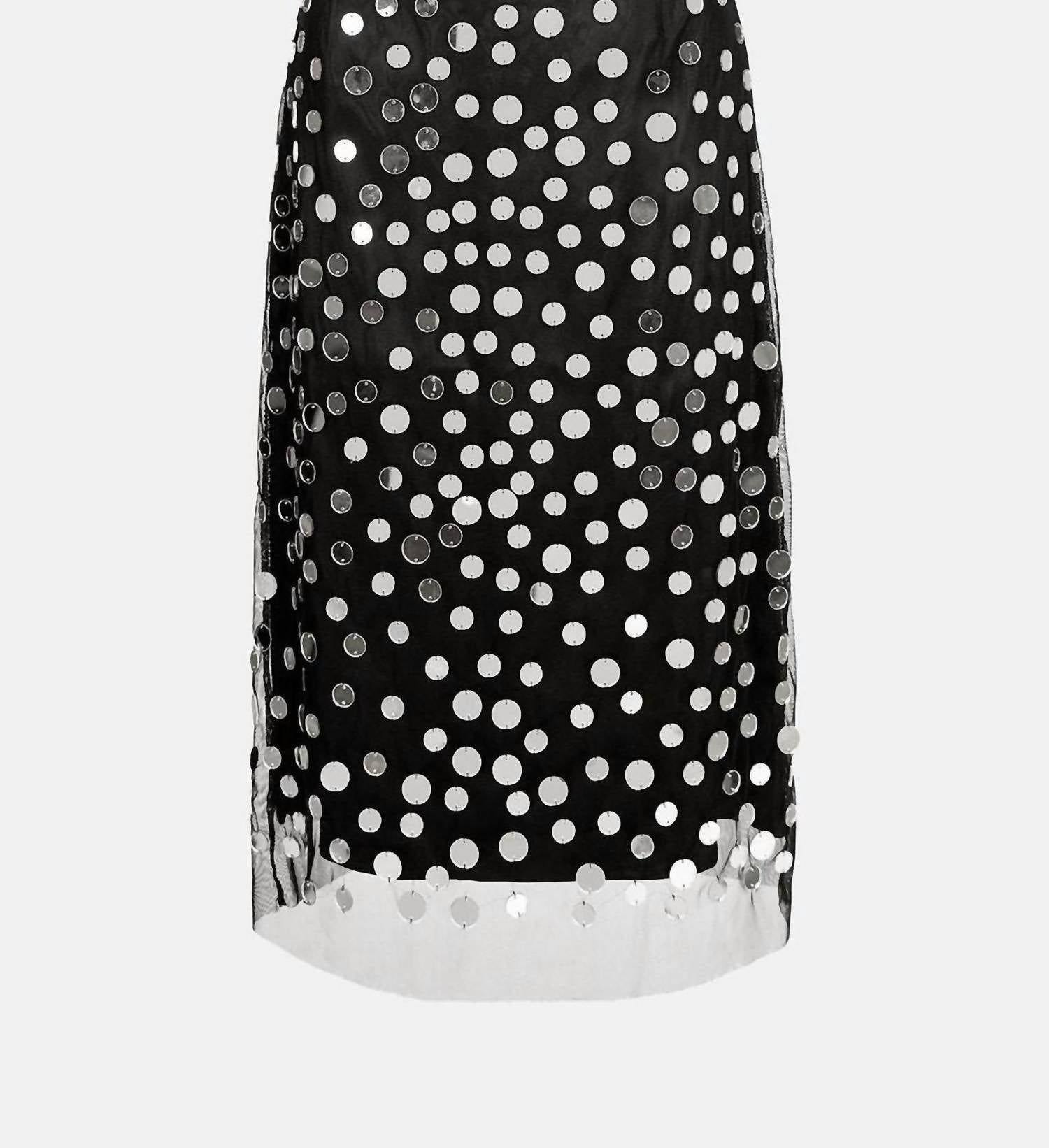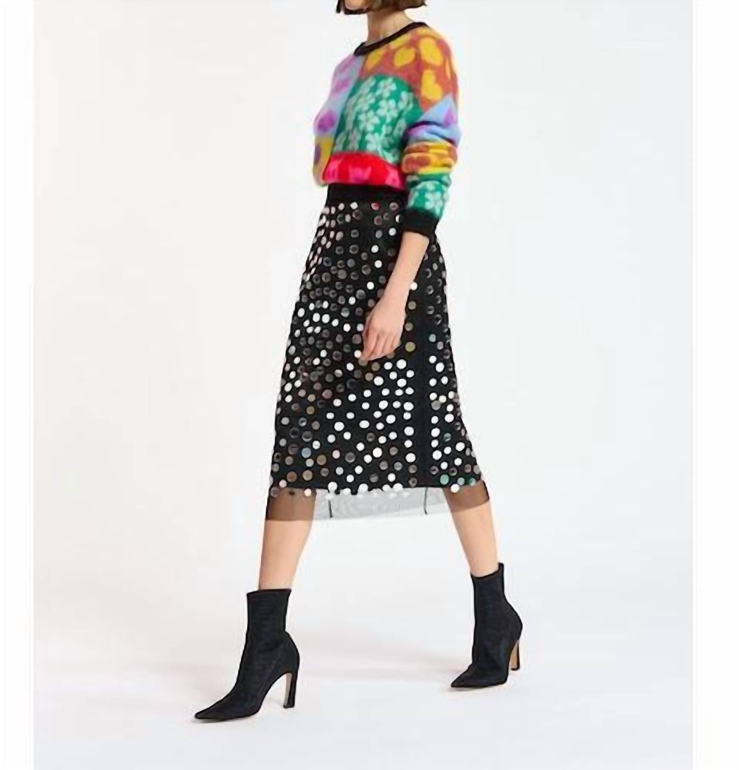 Show off just the right amount of skin in this beautifuly designed midi length skirt. Capture the spirit of disco with the Crescent Skirt by Essentiel Antwerp, a dazzling addition in black and silver. This high-rise midi skirt features a sleek straight cut and a playful raw cut tulle overskirt scattered with sparkling mirror sequins. Made from 100% polyester with a lining of 96% polyester and 4% elastane, it's detailed with a chic zip closure. Care: Dry clean only, with a length of 71 cm and tulle overskirt extending to 77.5 cm, ensuring a sleek fit for your evening events. Model is 177 cm tall and wearing size 36.