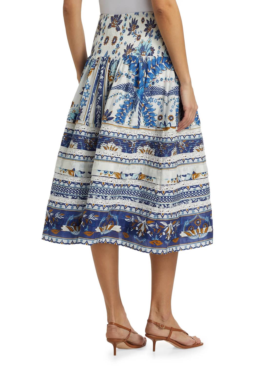 Show off just the right amount of skin in this beautifuly designed midi length skirt. Embrace 90s fashion this summer with the Ana Tapestry Cotton Midi Skirt by FARM RIO, perfect for vacation styling with its vibrant blue and white floral pattern. This 26" long midi skirt is crafted from a cotton blend featuring a banded smocked waistband and a subtle side zipper for effortless wear. The fabric composition boasts 57% cotton and 43% viscose, with a 100% viscose lining for added comfort. Care for this piece by machine washing and laying it flat to dry.